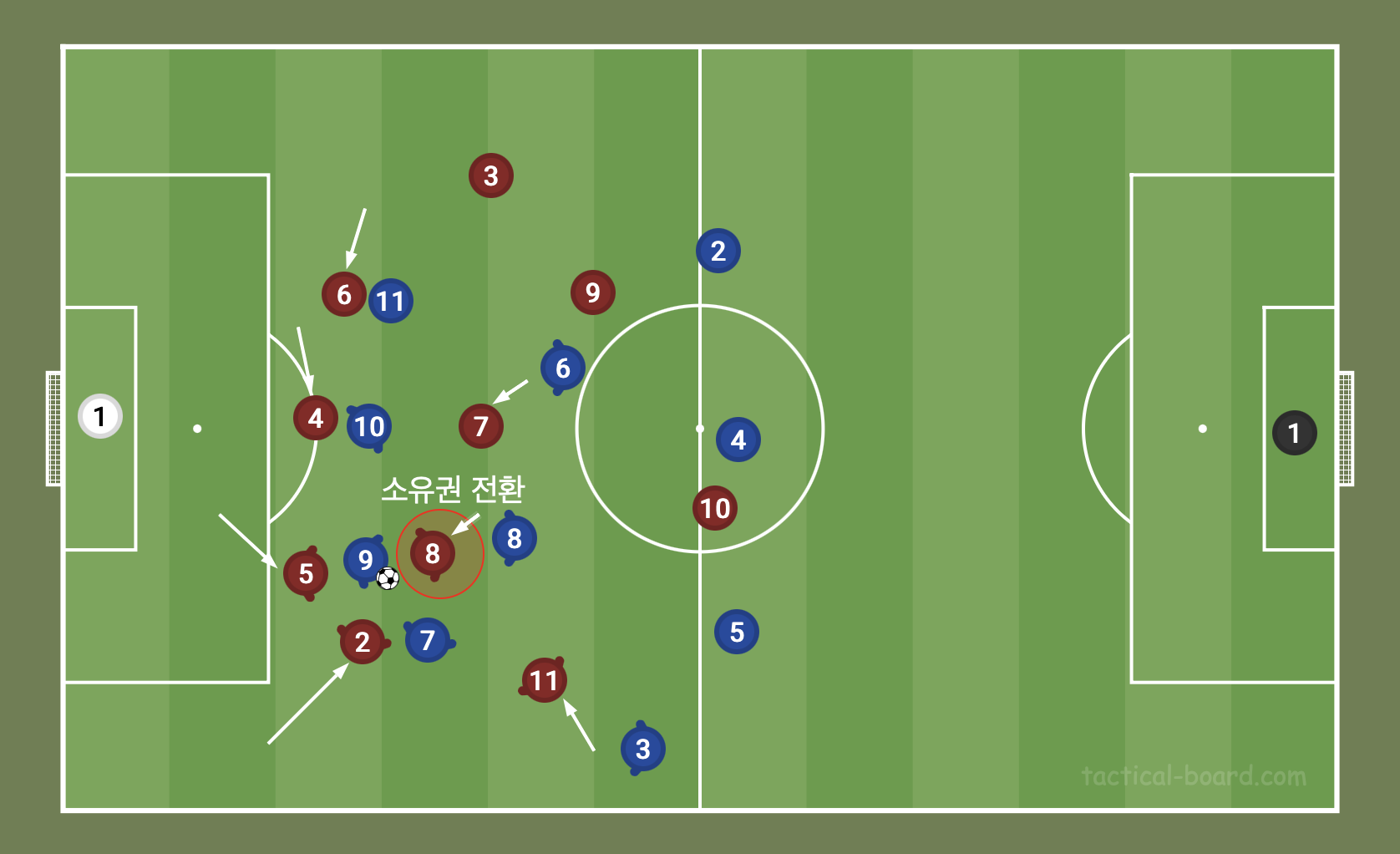 만약 볼 터치 미스가 일어나거나 몸을 닫을 때 압박트리거 발동할 수 있다. 그렇게 허벅지를 이용하면서 바짝 붙어 수비가 뒤로 물러나게끔 만들 수 있다.