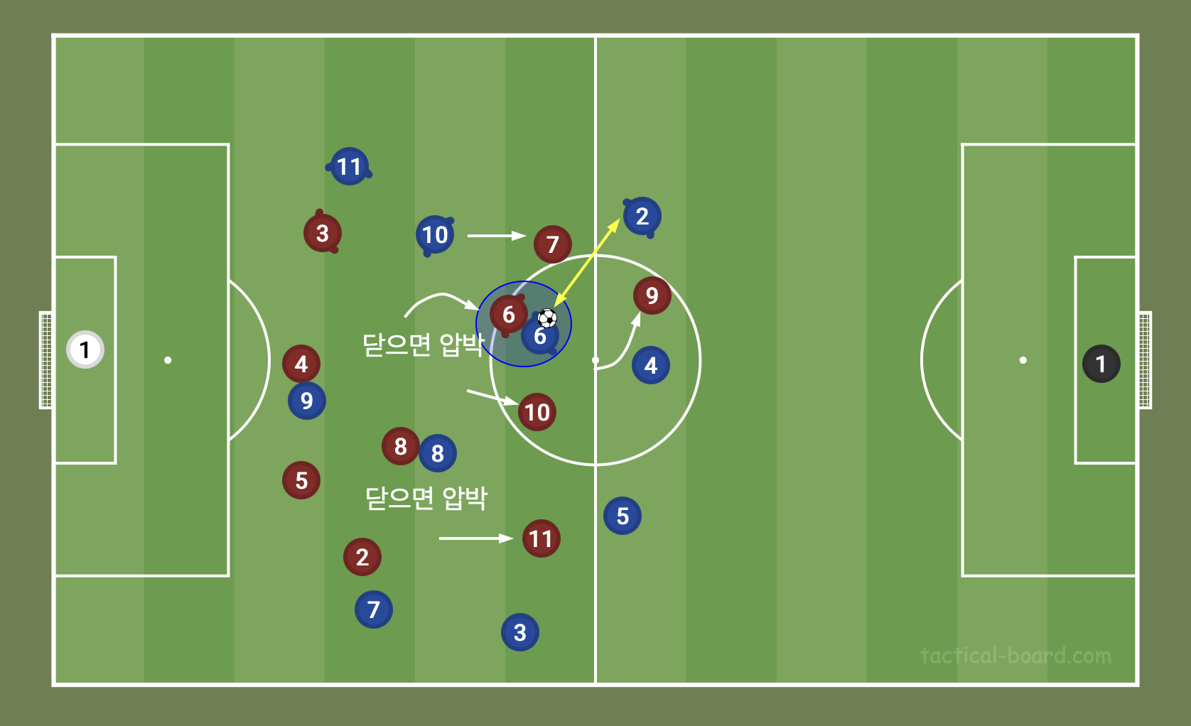 하지만 압박트리거가 발동된 상태에서 한 선수가 공을 잡았을 때 2vs1 상황이 나오게 되는 경우가 생긴다. 그렇게 되면 1vs1처럼 접근을 하다 3m가량 거리 유지를 하면서 패스길 차단하면서 터치 방향을 유도하면 된다.