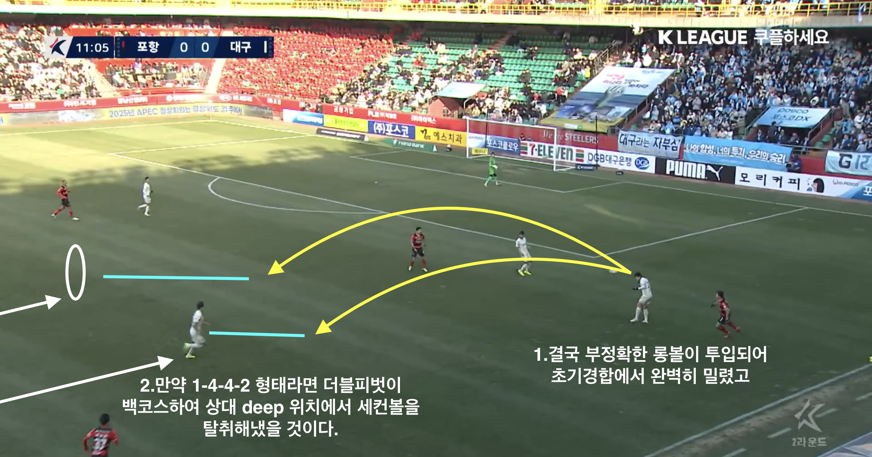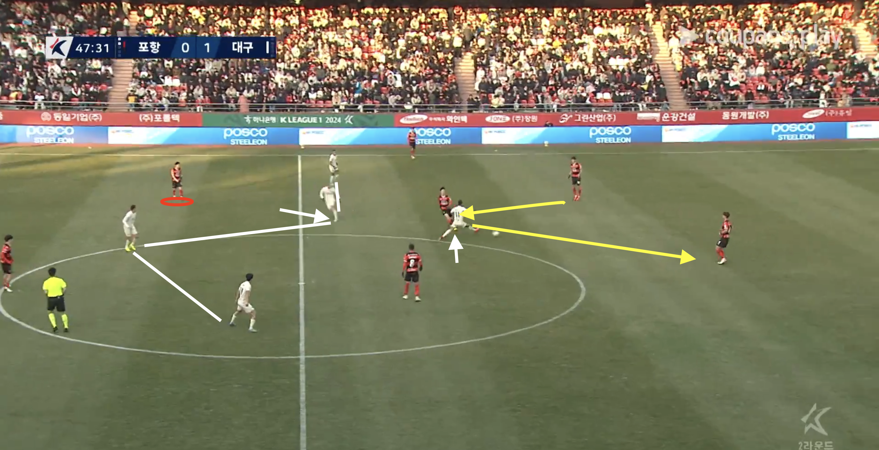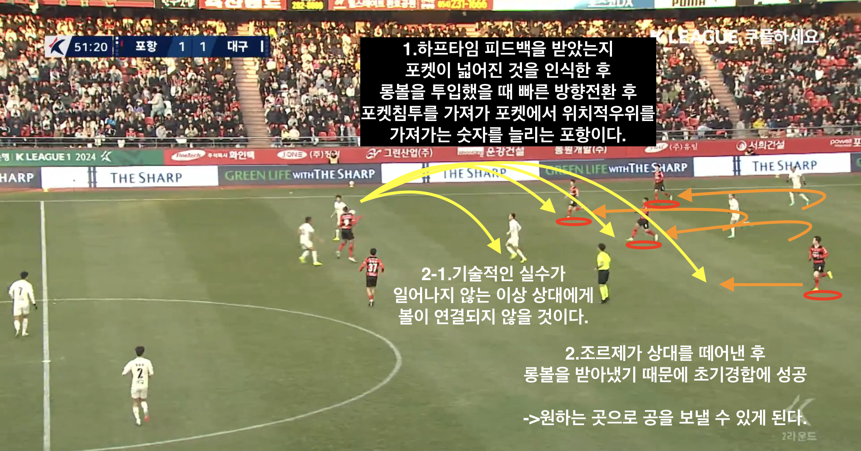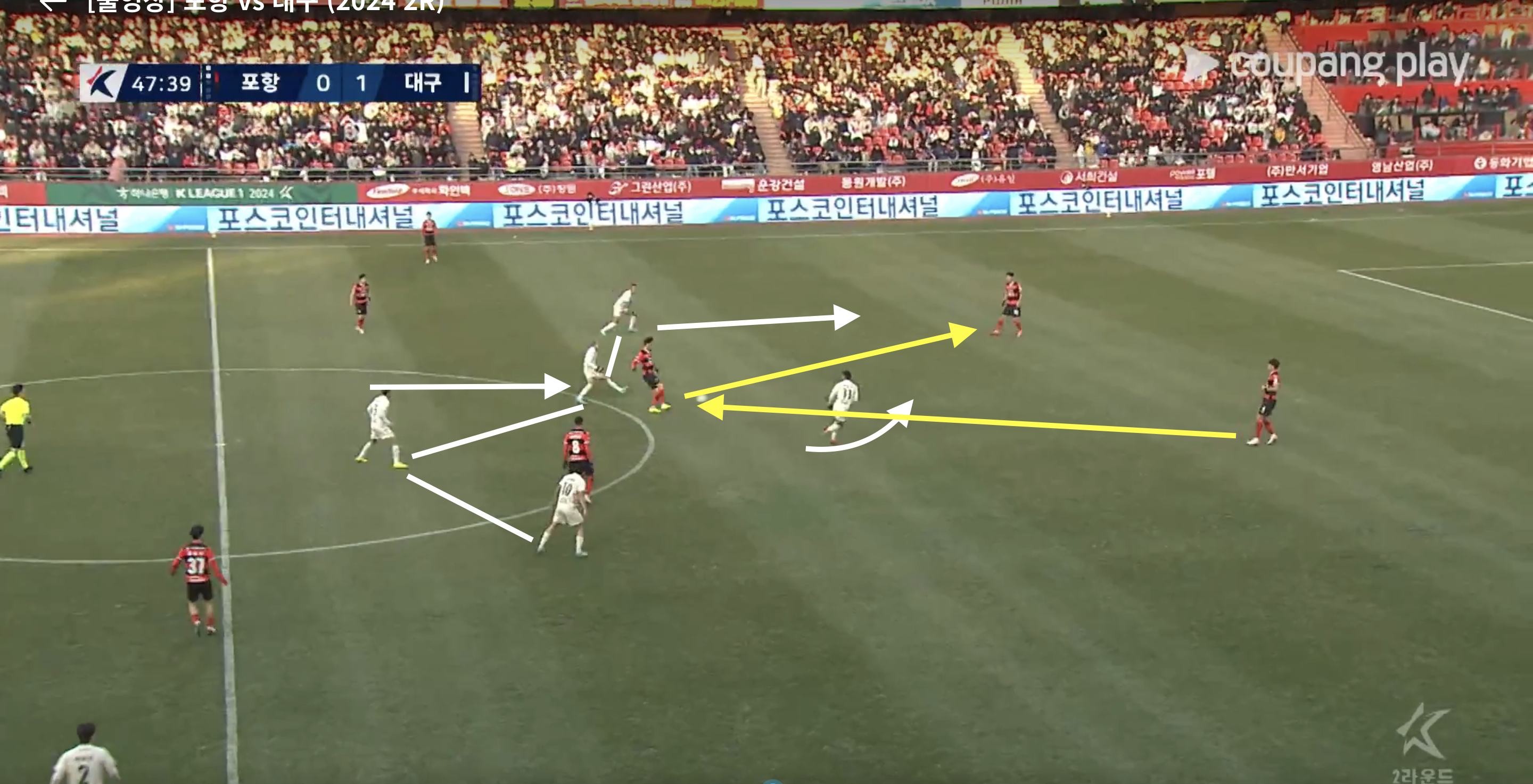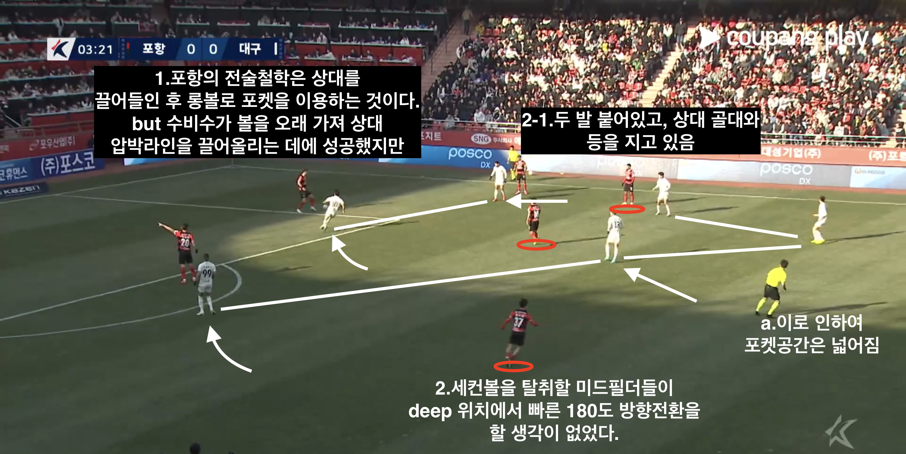 하지만 공을 가지지 않은 2선들이 빠르게 방향전환을 하지 않고 가만히 있었기 때문에 포켓을 커버하는 선수는 전무했고, 결국 대구에게 세컨볼을 쉽게 허용하는 장면이 나오게 된다. 의도적인 롱볼을 투입하는 편인 포항이지만 세컨볼에 대한 대비가 잘 되어있지 않는 모습이다.