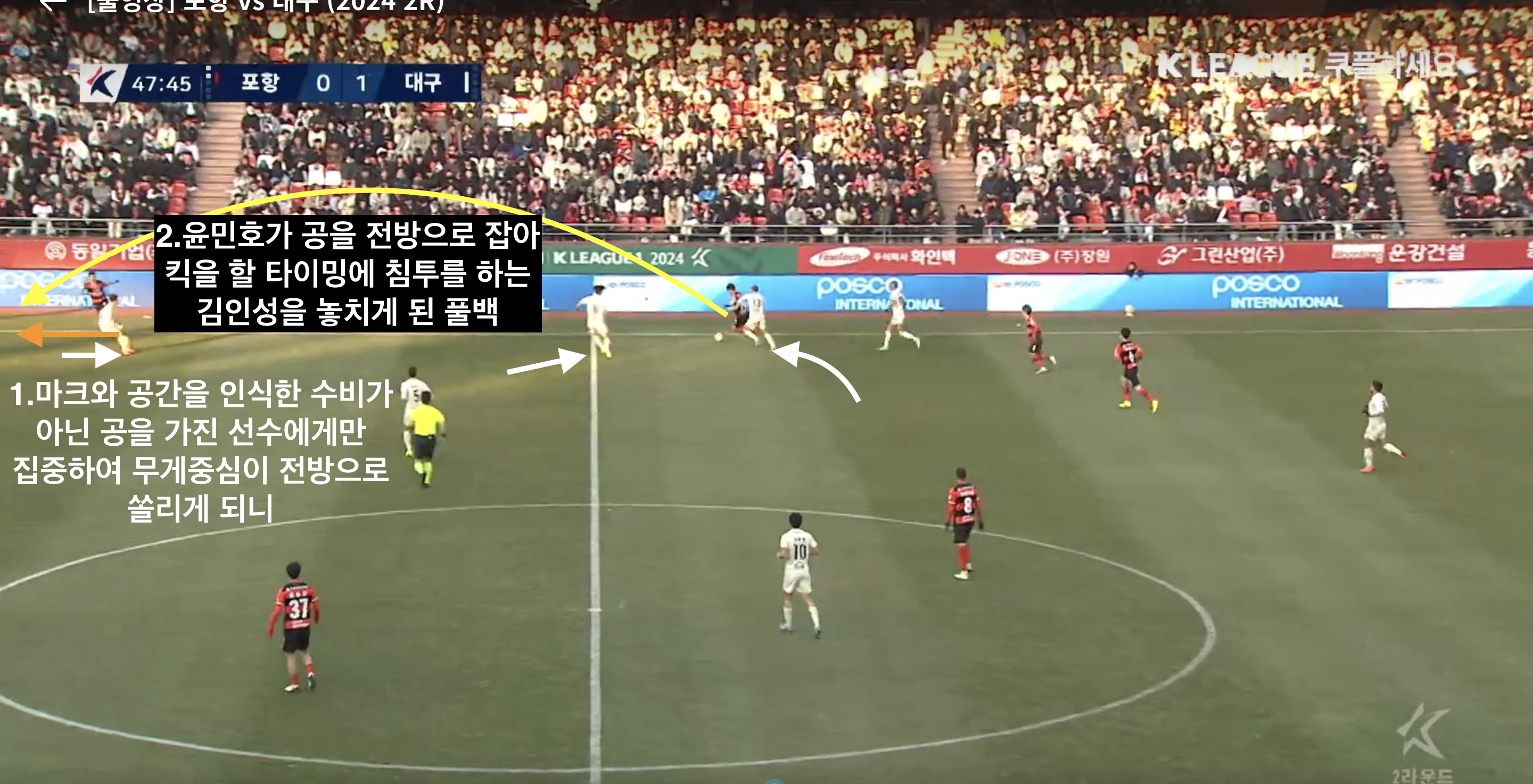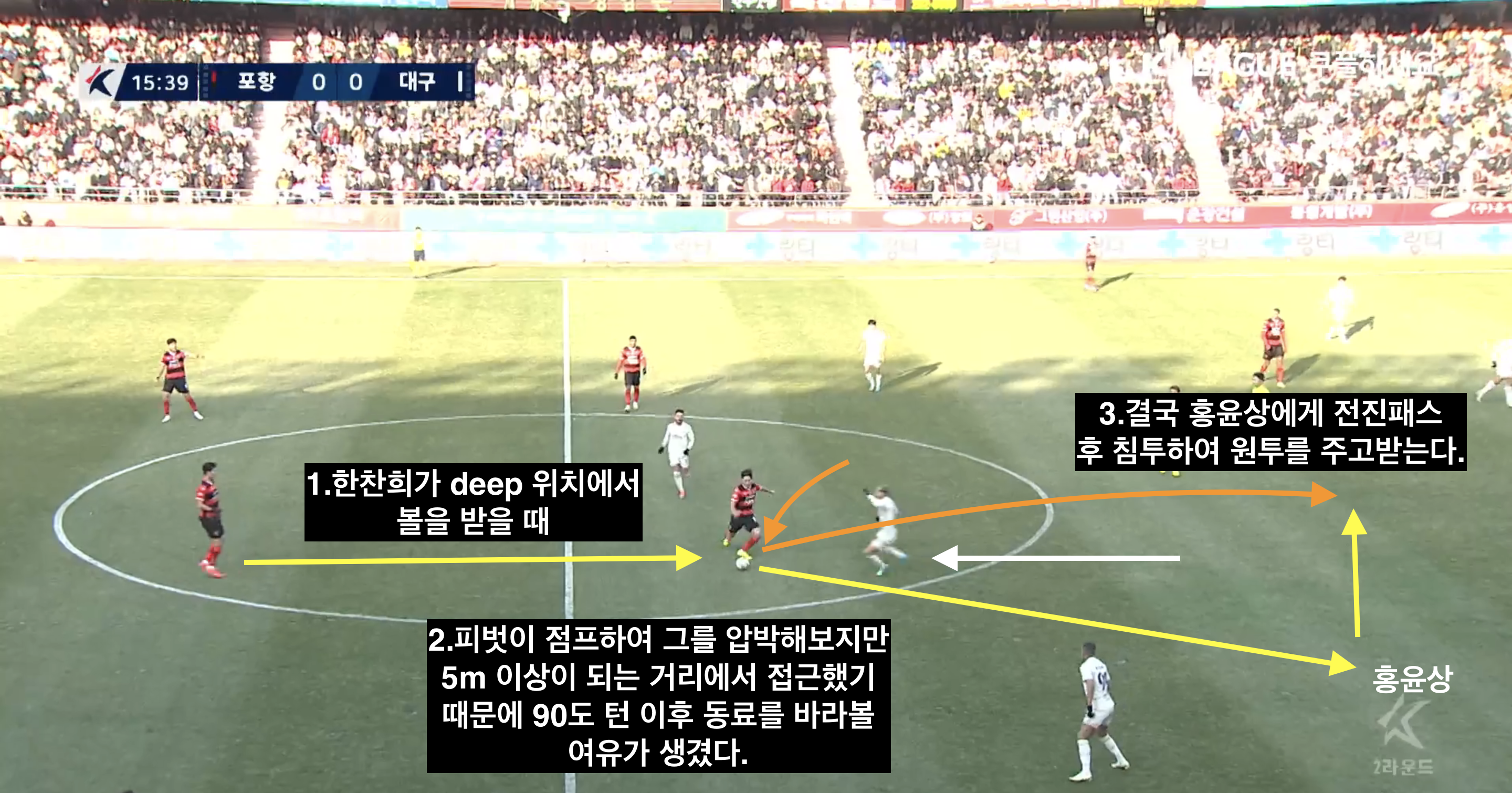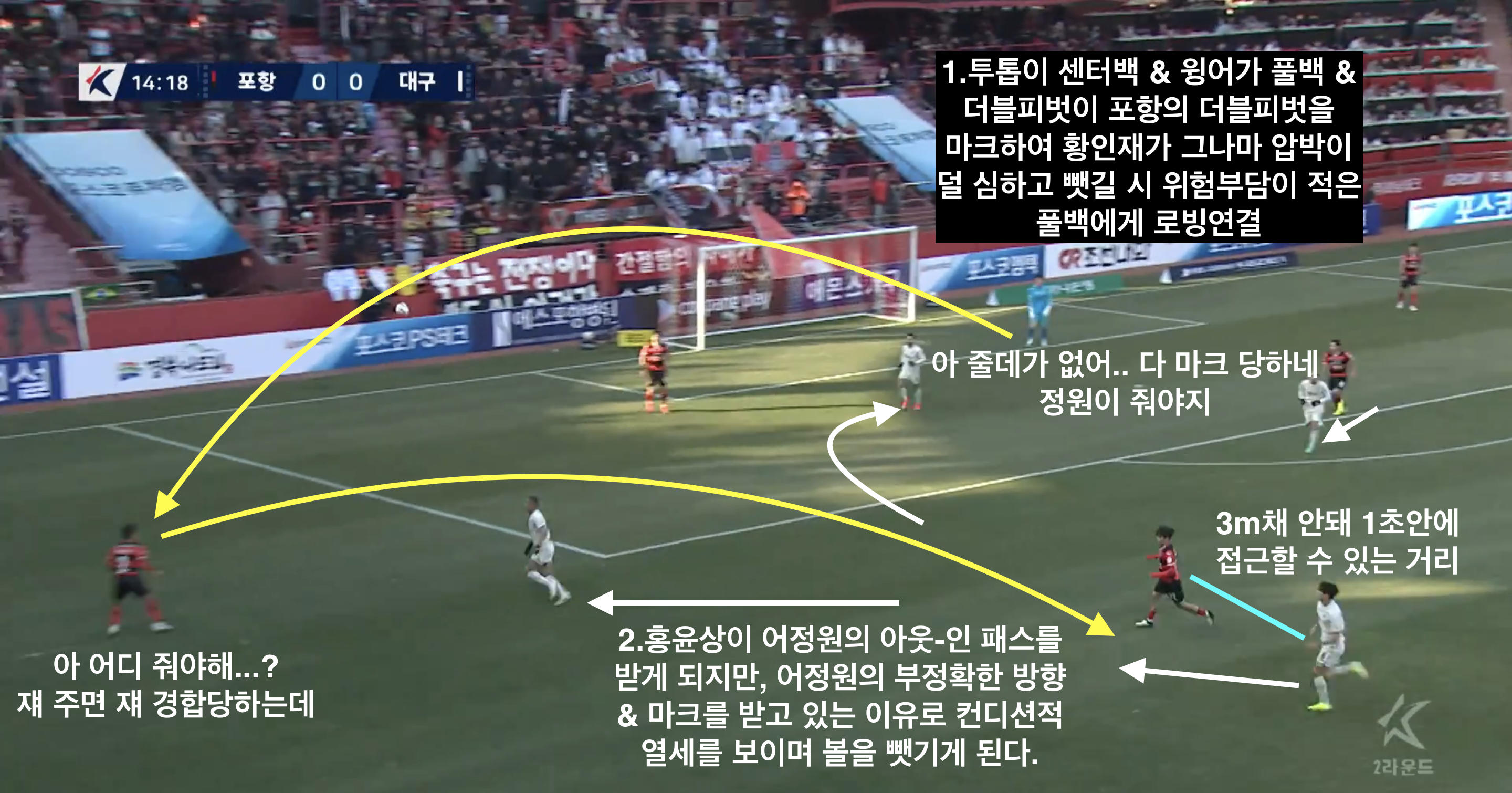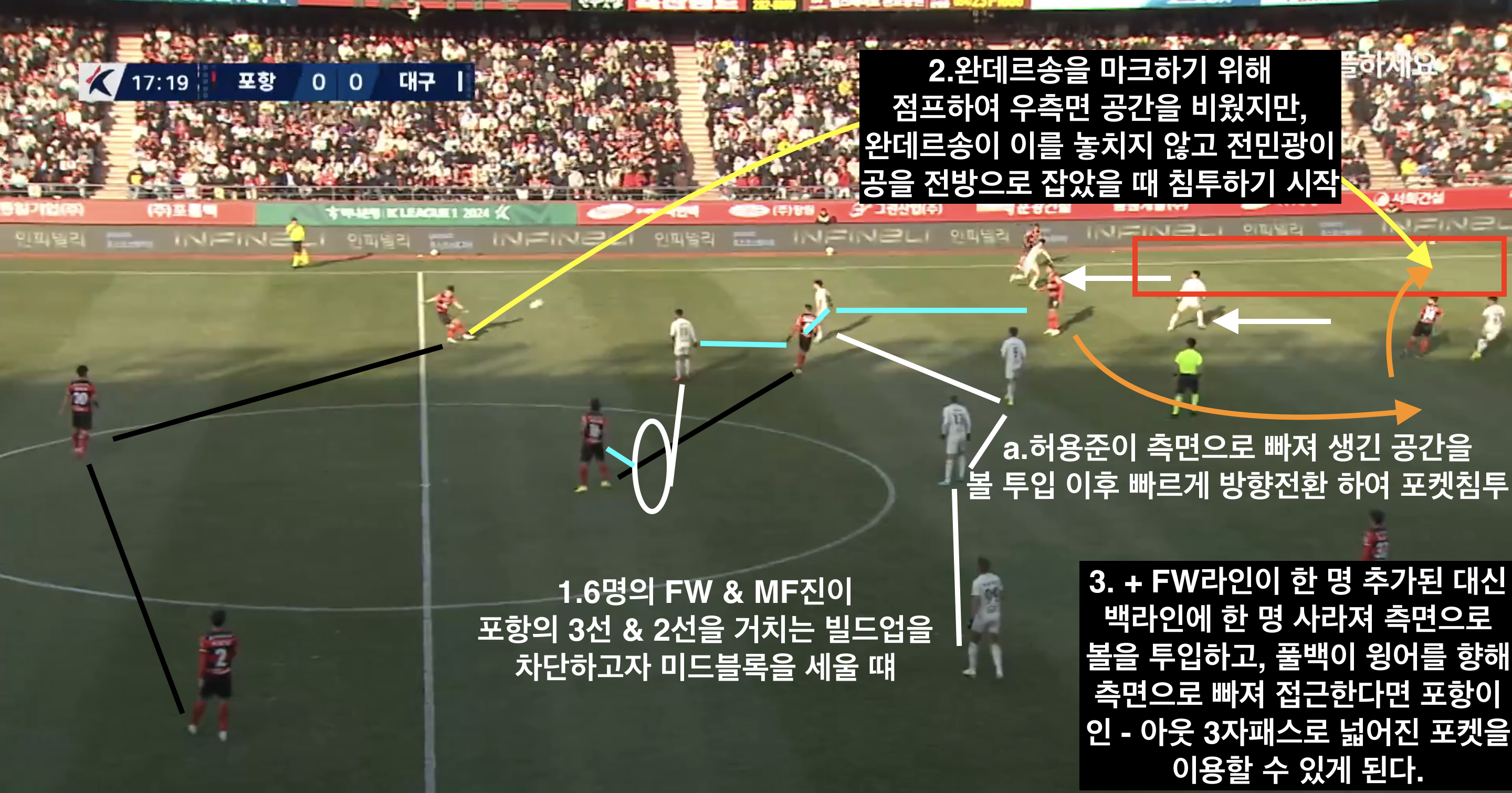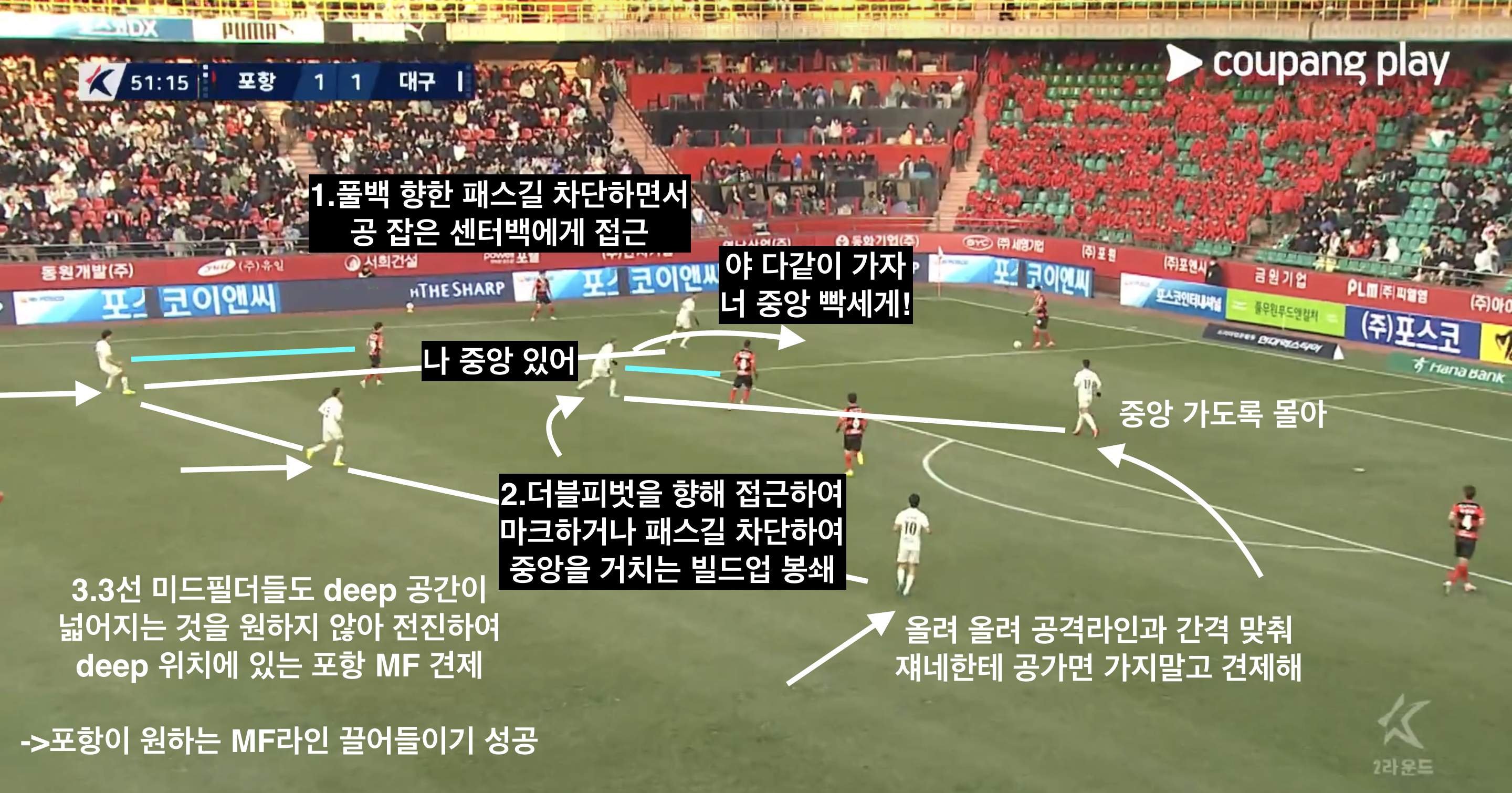 하지만 공을 가지지 않은 2선들이 빠르게 방향전환을 하지 않고 가만히 있었기 때문에 포켓을 커버하는 선수는 전무했고, 결국 대구에게 세컨볼을 쉽게 허용하는 장면이 나오게 된다. 의도적인 롱볼을 투입하는 편인 포항이지만 세컨볼에 대한 대비가 잘 되어있지 않는 모습이다.