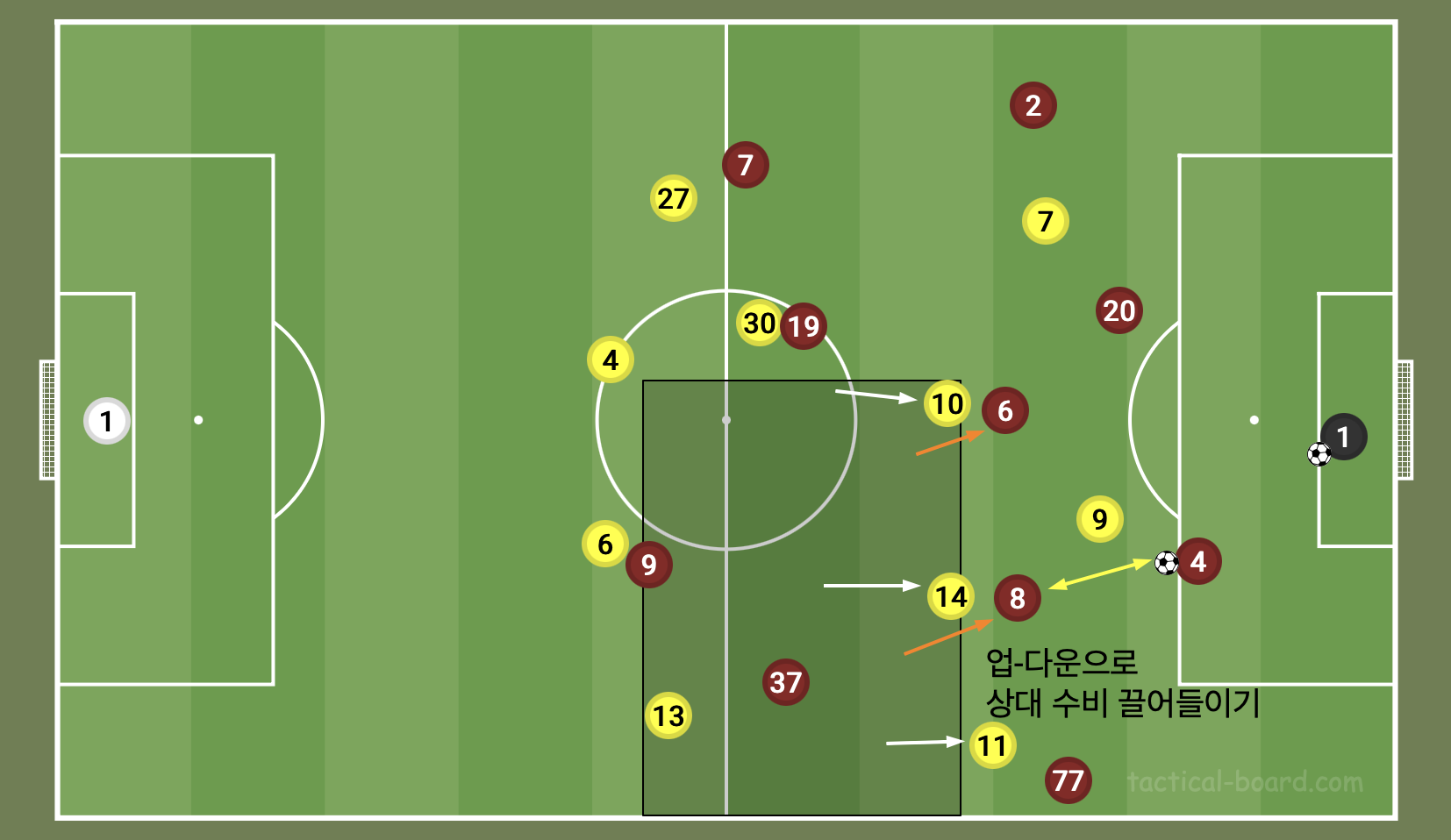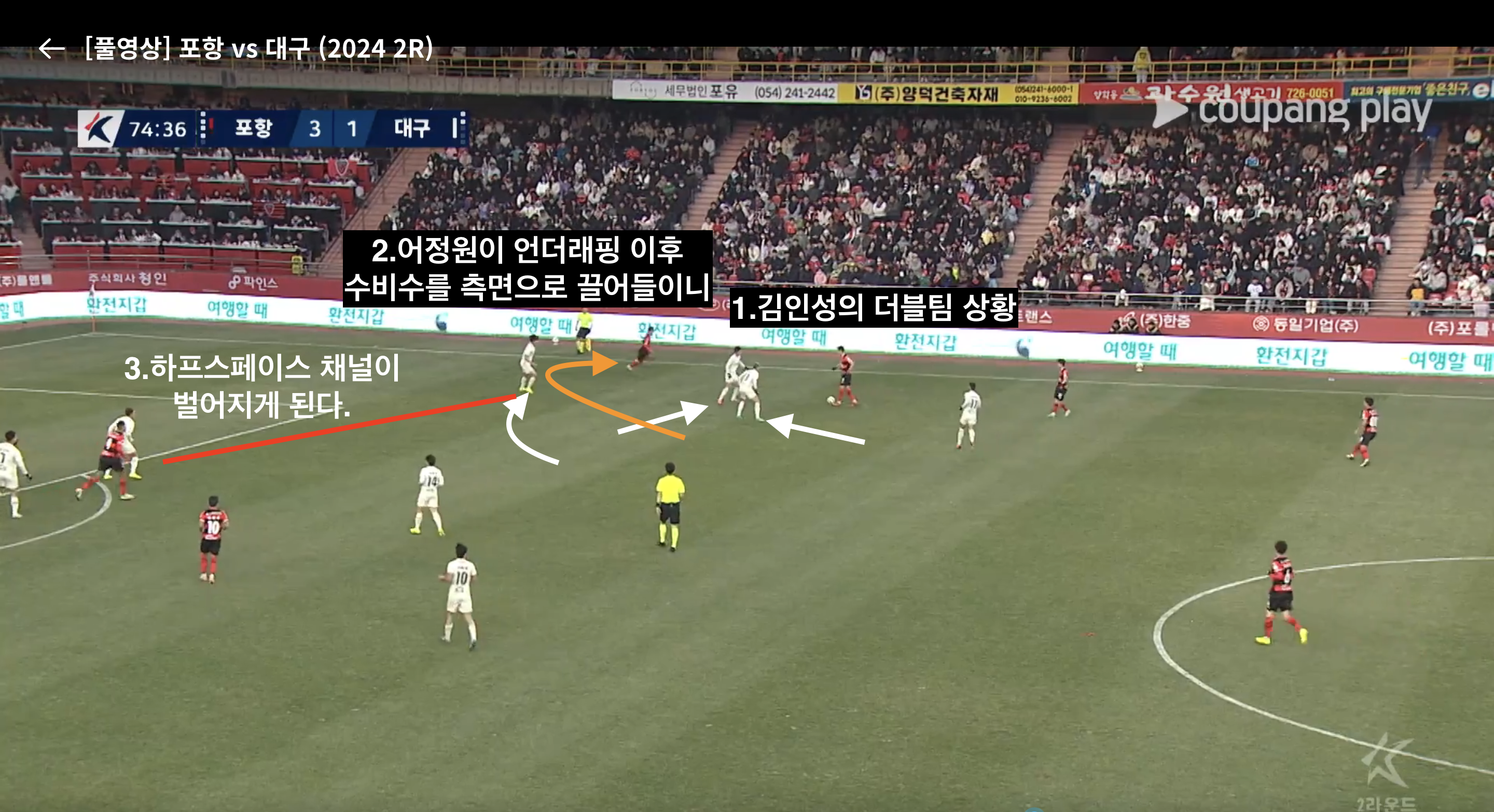 이렇게 상대 압박라인을 끌어올리게 만들면 포켓공간이 벌어진 것을 확인할 수 있다. 어정원에게 연결에 성공했을 때 어정원이 전방을 향해 퍼스트터치를 가져갔다면, 윤민호가 포켓을 발견하여 측면으로 빠져 어정원의 패스를 받으러 가는 액션이 나오게 된다.