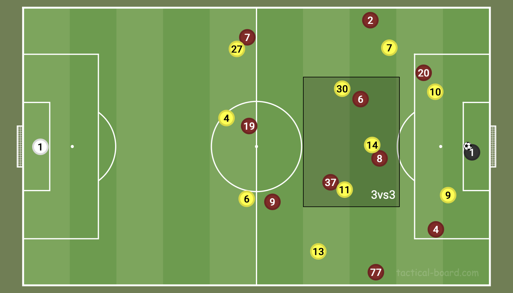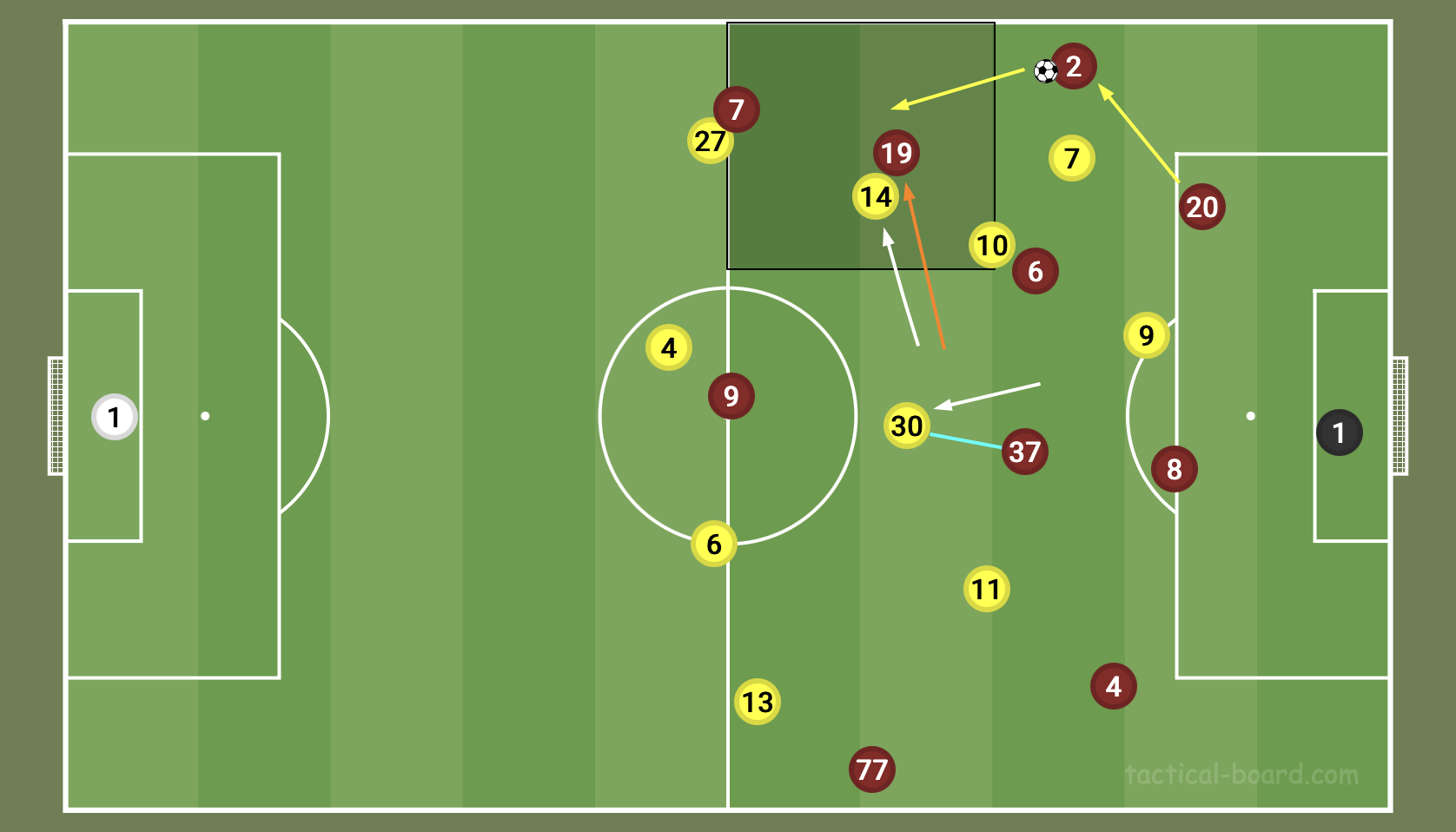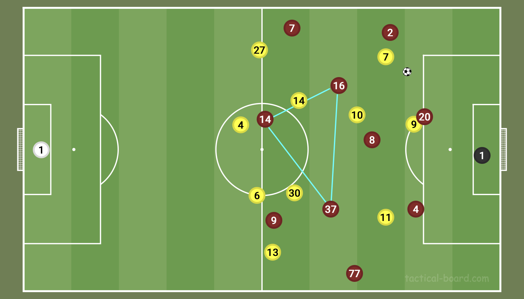 결국 전체적인 라인은 파이널서드까지 올라가게 되었다. deep 공간에서 김종우가 볼을 잡을 때 포켓을 커버하는 선수가 있었기 때문에 김종우가 전진패스를 할 옵션이 3가지나 존재하게 된다.