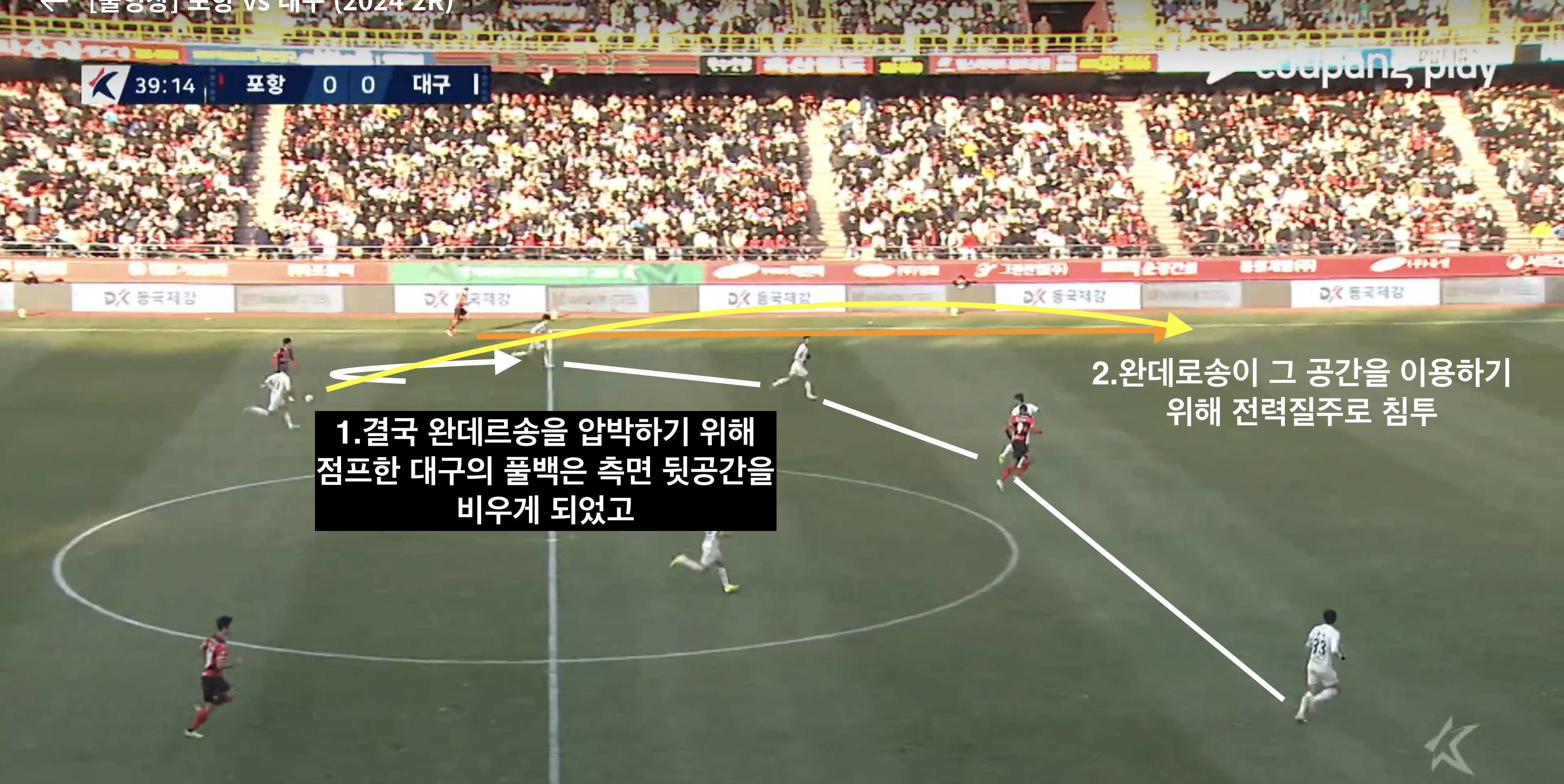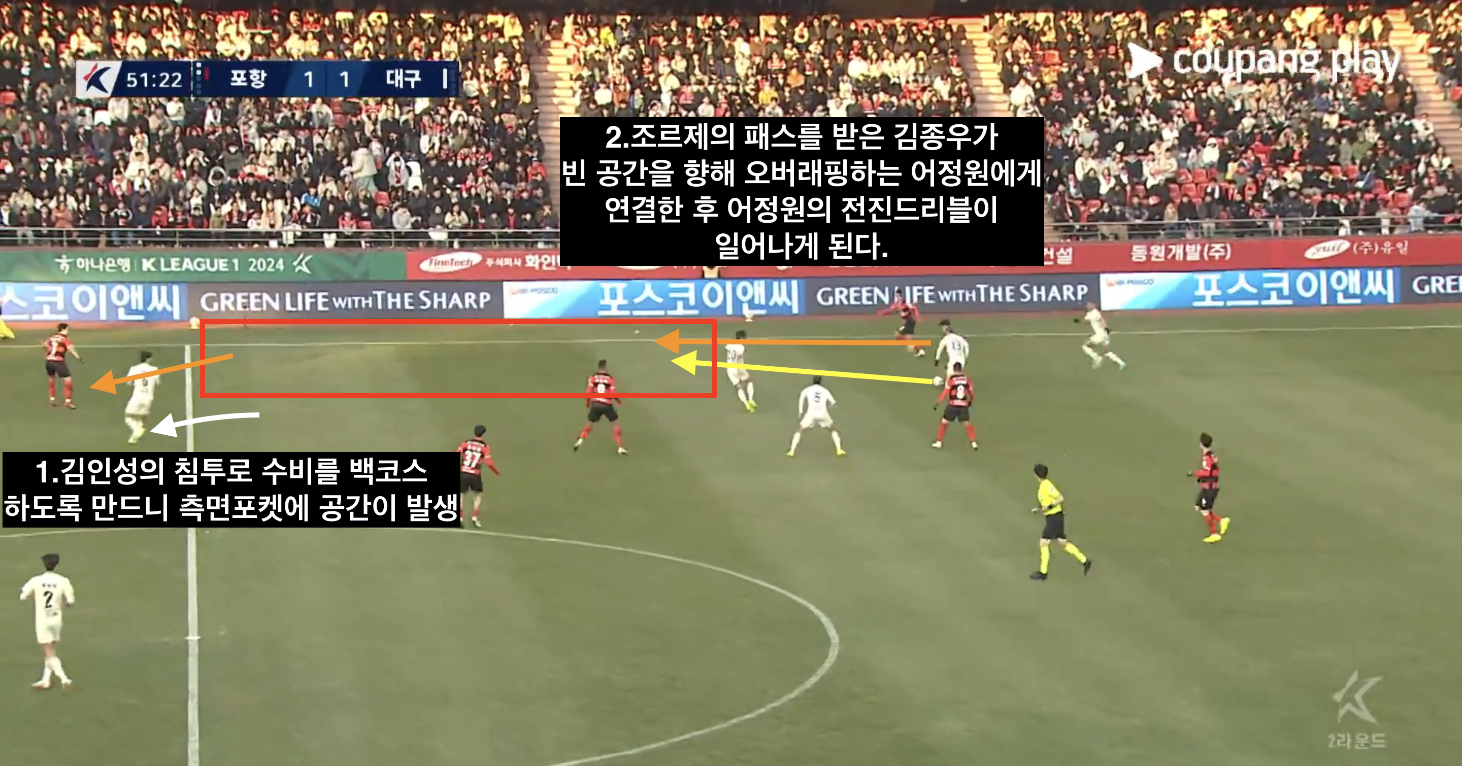 측면에서 센터백이 볼을 잡았을 때 상대는 포항의 공격수들을 압박하기 위해 점프를 하게 된다. 아래 사진처럼 풀백이 점프를 하게 되면 측면 뒷공간이 노출되고, 톱자원이 상대를 끌고 측면 대각선 침투를 이어나가면 2선에 있던 상대가 돌아 뛰어 포켓공간을 이용하는 형태로 포항은 측면에서 롱볼 전개를 할 수 있다.