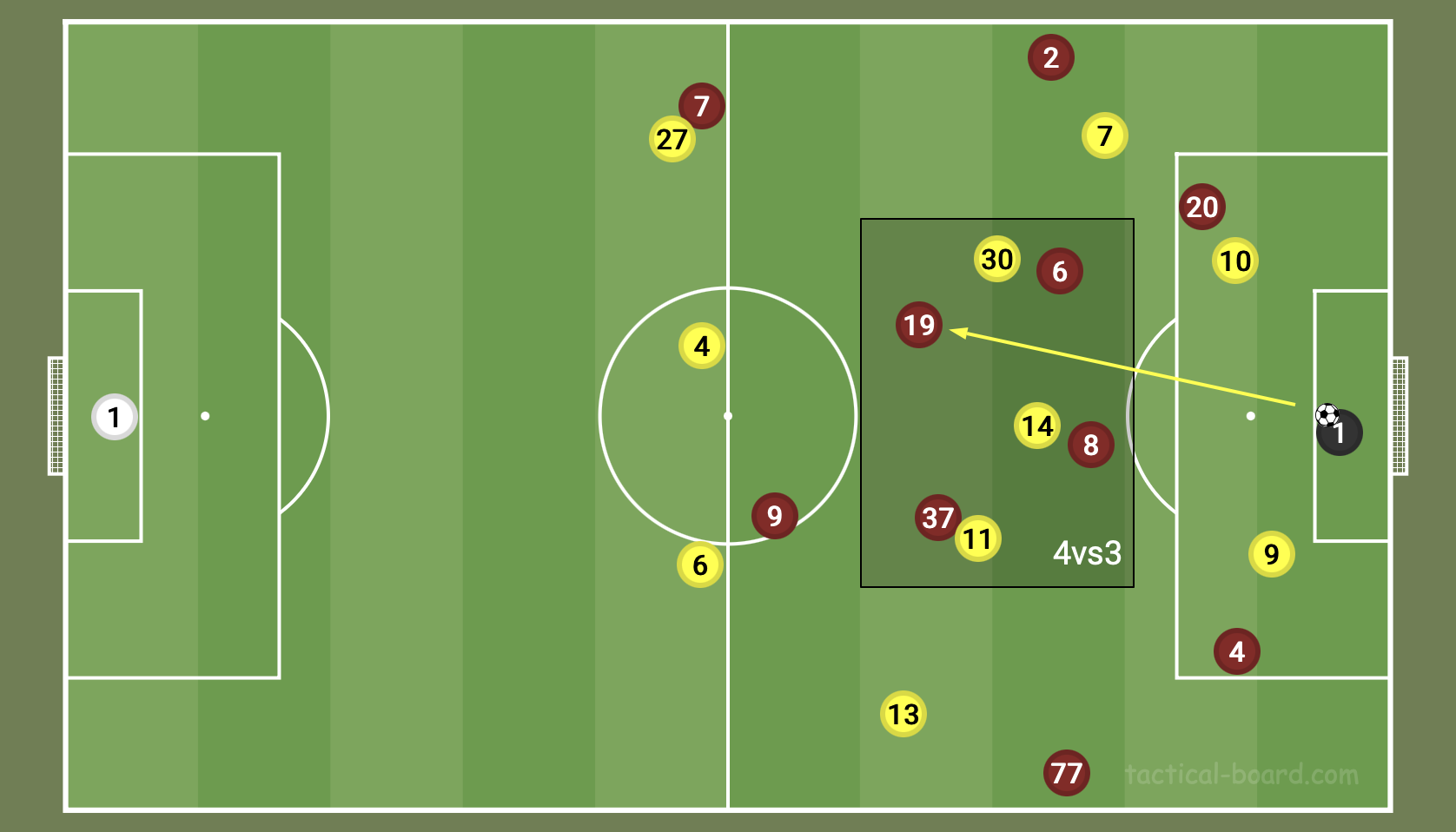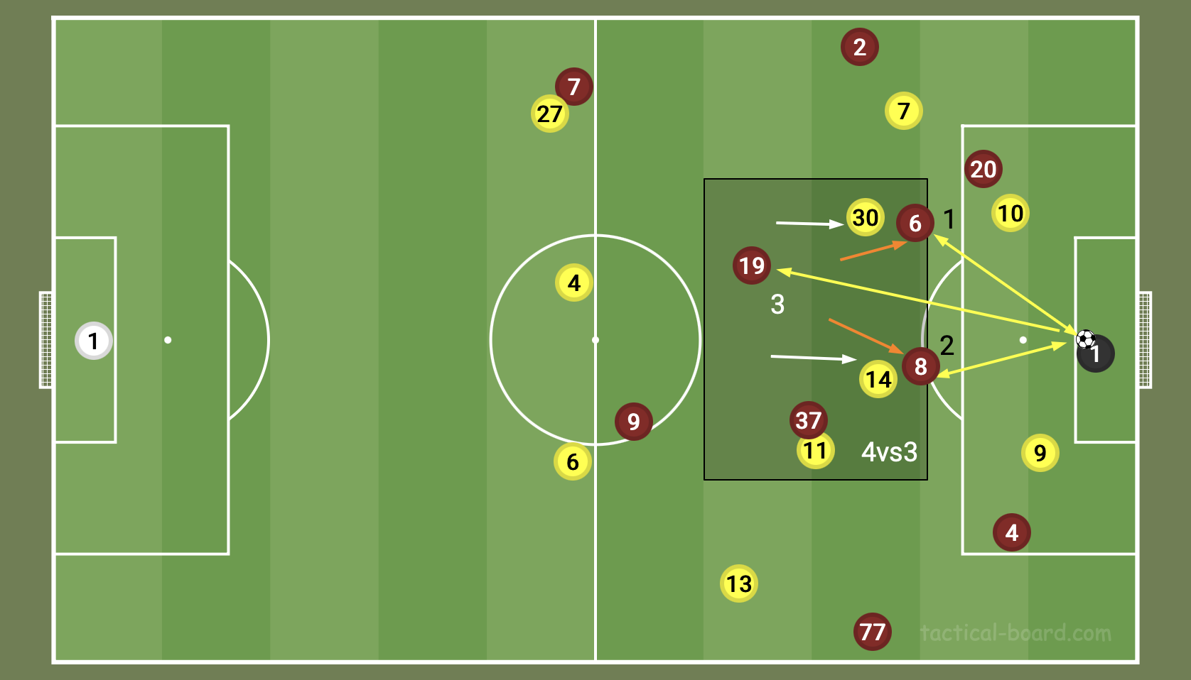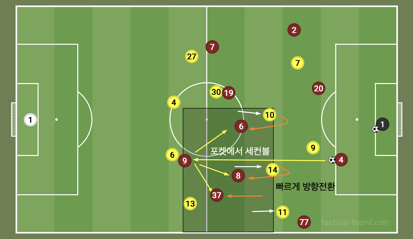 이번에도 비슷하다. 상대를 끌어들인 후 넓어진 포켓을 이용하기 위해 타겟맨을 향해 롱볼을 투입하는 것이다. 달라진 부분은 롱볼을 투입했을 때 공을 가지지 않은 선수들이 빠르게 방향전환을 하고 포켓으로 빠르게 침투했다는 점이다. 그래서 세컨볼을 리시브 하는 데 성공한 모습을 보였던 것이다.