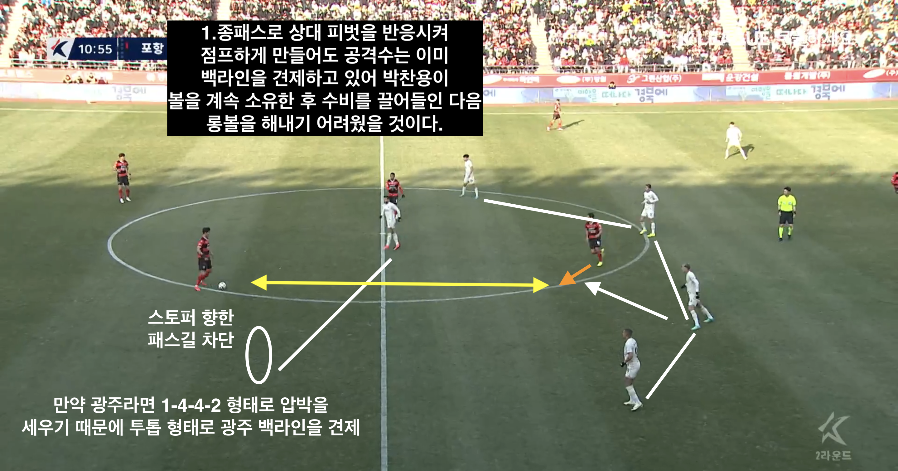 그래서 광주는 상대가 3MF를 들고 나올 때 MF에서 3vs3 구도가 나오도록 만들어야 한다. 기존처럼 피벗을 점프하고, 측면 미드필더를 좁히면 포켓은 커버할 수 있지만, 포항의 라이트백이 프리맨이 되어 포항이 잘하는 우측면 공격을 허용할 수 있다. 그래서 광주는 포항을 상대로 MF에서 수적으로 열세에 놓이지 않으려면 압박 시 톱자원인 이희균을 내리게 만들어 1-4-1-4-1 형태를 만들어 3vs3 구도가 나와 포항이 중앙을 거쳐가는 플레이가 나오지 않도록 만들 필요가 있다.