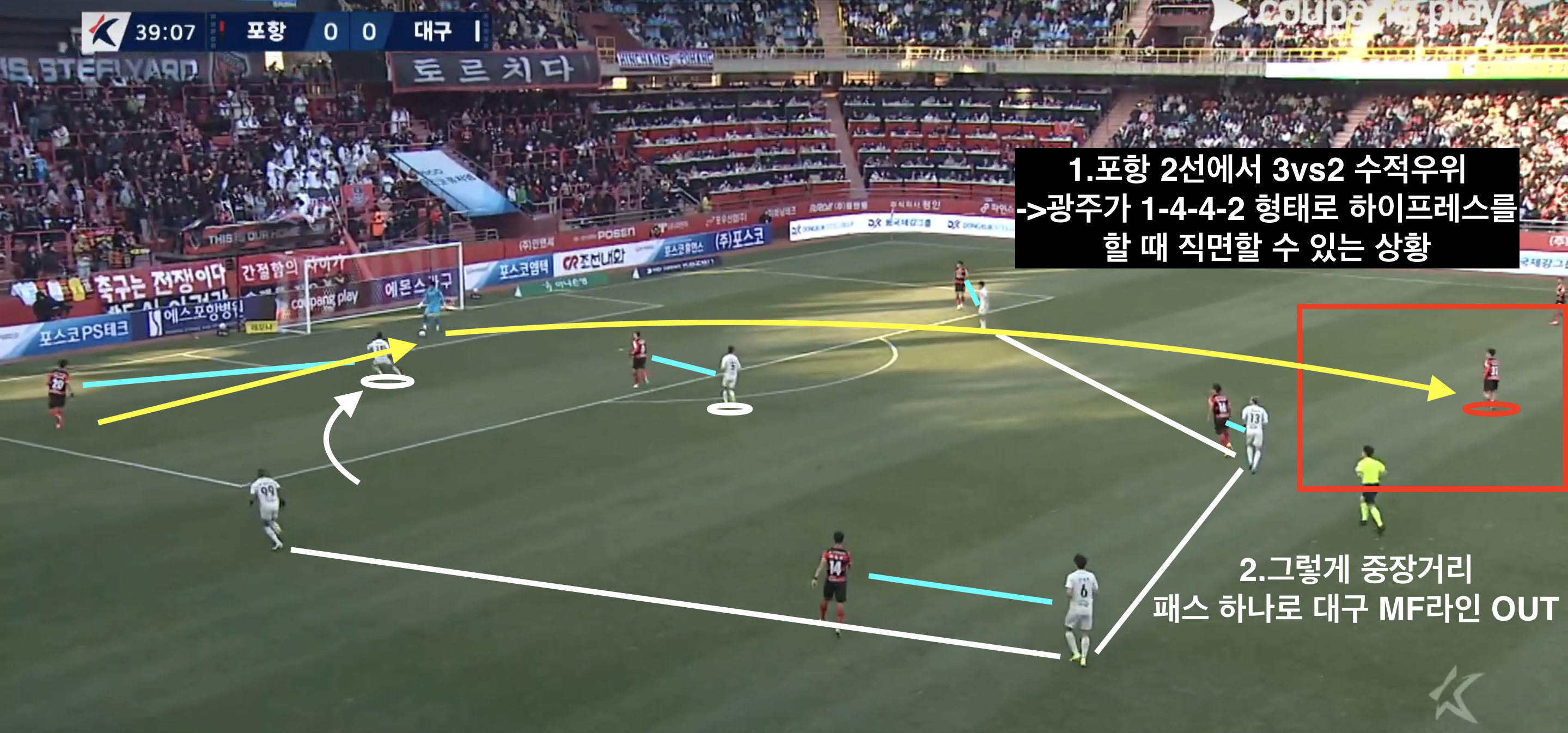이런 상황이 나오기 전에 포항은 롱볼 이후 포켓에서 세컨볼을 탈취했던 것이 원인이 되었다. 그 점을 메인 공격루트로 자리를 잡기 위해 포항은 대구와의 후반전을 바탕으로 미드필더의 방향전환 기동력과 어질리티를 발전시킬 수 있는 훈련을 진행 중일 것이다. 그래서 광주는 롱볼이 투입될 때 빠르게 방향전환을 한 후 백코스하여 포켓을 커버하는 피벗의 스탠스가 필요하다.