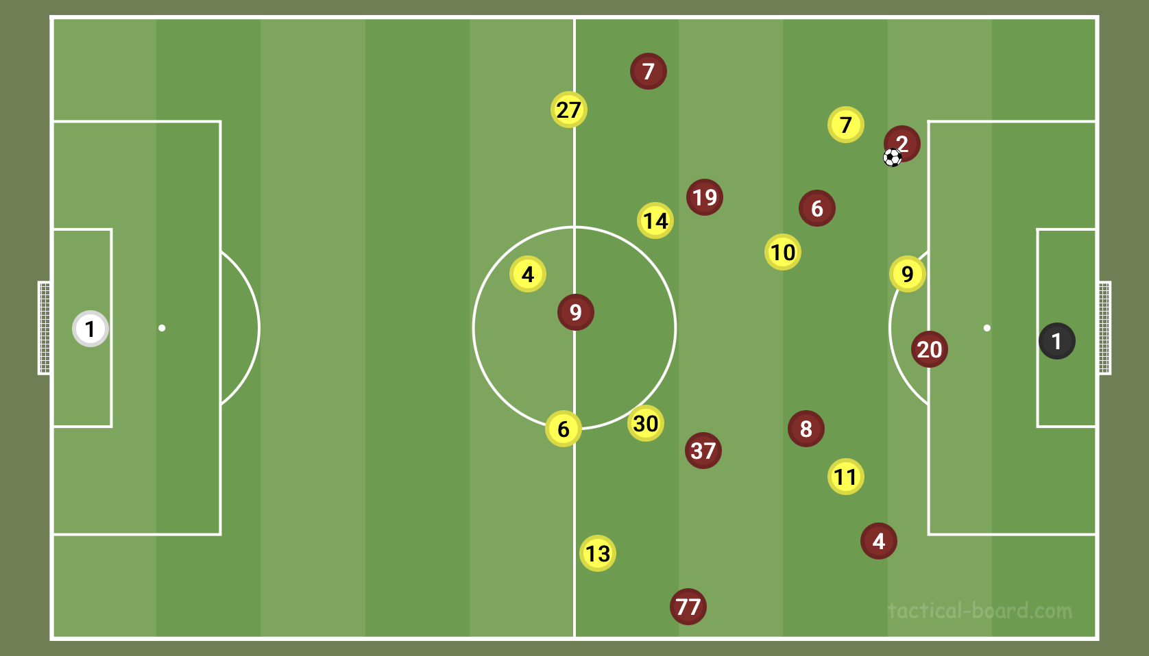 그리고 더블피벗이기 때문에 만약 롱볼이 투입되어도 2명의 피벗이 백코스하여 포켓을 커버하고 세컨볼을 탈취해낼 수 있기 때문에 롱볼을 상대하는 입장에서 좋은 환경일 것이다. 만약 위에 서술했듯이 1-4-1-4-1 형태로 압박을 하게 된다면 1명은 포켓을 커버하고, 최대 2명이 백코스를 하기 때문에 최대 3명이 세컨볼 경합을 할 수 있는 수적인 메리트가 존재한다.