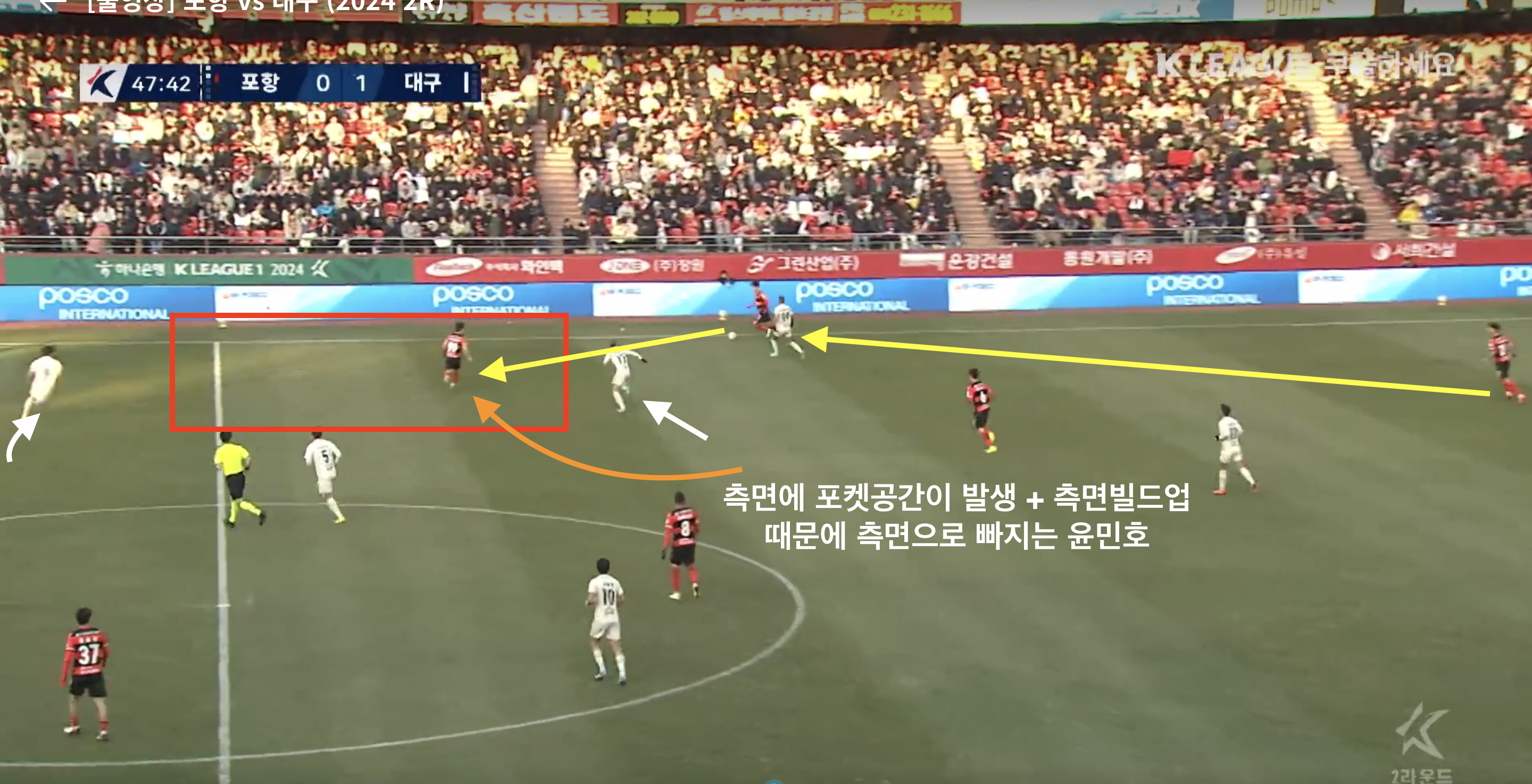 이렇게 윤민호가 측면으로 빠져 포켓을 이용할 수 있기 때문에 횡적으로 넓은 공간을 커버할 수 있는 구조가 필요하다. 정호연의 역할이 중요하게 된 것이다. 1-4-4-2 형태로 압박하거나 1-4-1-4-1 형태로 압박을 진행할 때에는 구조가 다르지만 정호연이 윤민호가 전방을 바라보지 못하도록 강하게 압박할 필요가 있다. 그때 반대쪽 2선 미드필더는 약간 백코스하여 포켓을 커버하면서 동시에 자신의 마크맨에게 볼이 연결되는 것을 염두해야 한다.