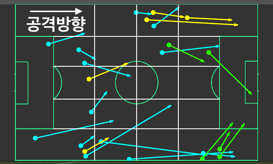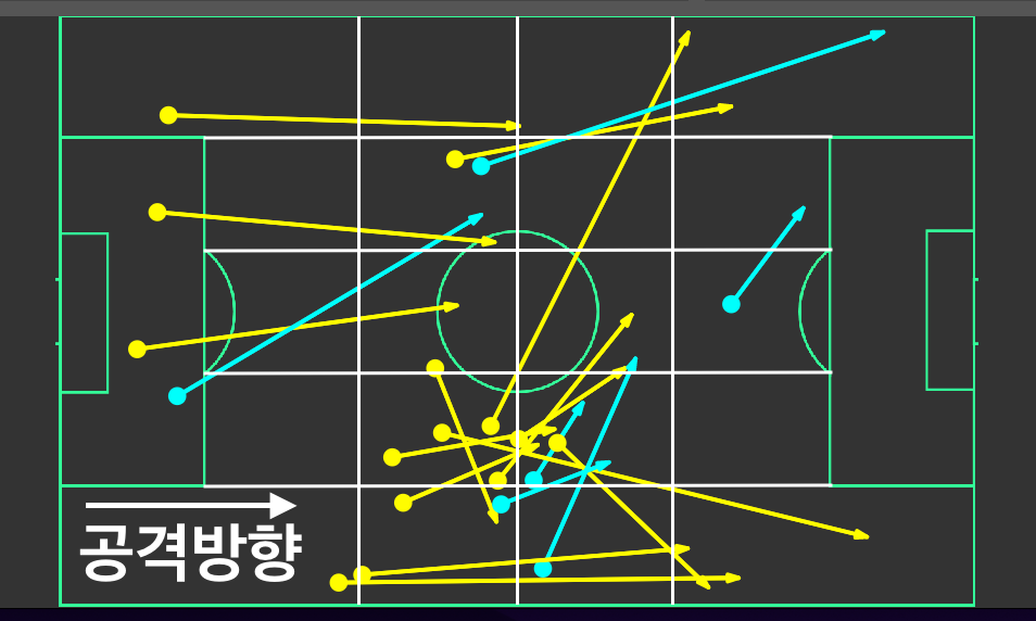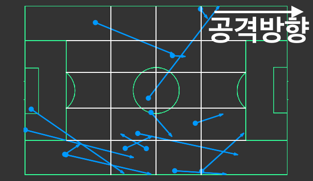 과연 후반전을 어떨까? 후반전에는 총 18회의 MF라인 통과패스에 성공하였다. 이 중 13회(72.2%)가 2차공격으로 이어져 전반에 비해 시간적, 공간적 여유가 주어졌던 것이고 안정화가 찾아오게 된 것이다. 디펜스서드에서 숏패스가 7회로 후방에서부터 안정적인 빌드업을 해냈다고 볼 수 있고, 전체적인 MF라인 통과패스가 측면{좌측면 향한 패스 6회(33.3%), 우측면 향한 패스 5회(27.8%)}을 향했는데, 1차빌드업을 풀어낸 이후에는 측면공격을 주로 진행했다는 것을 알 수 있다.