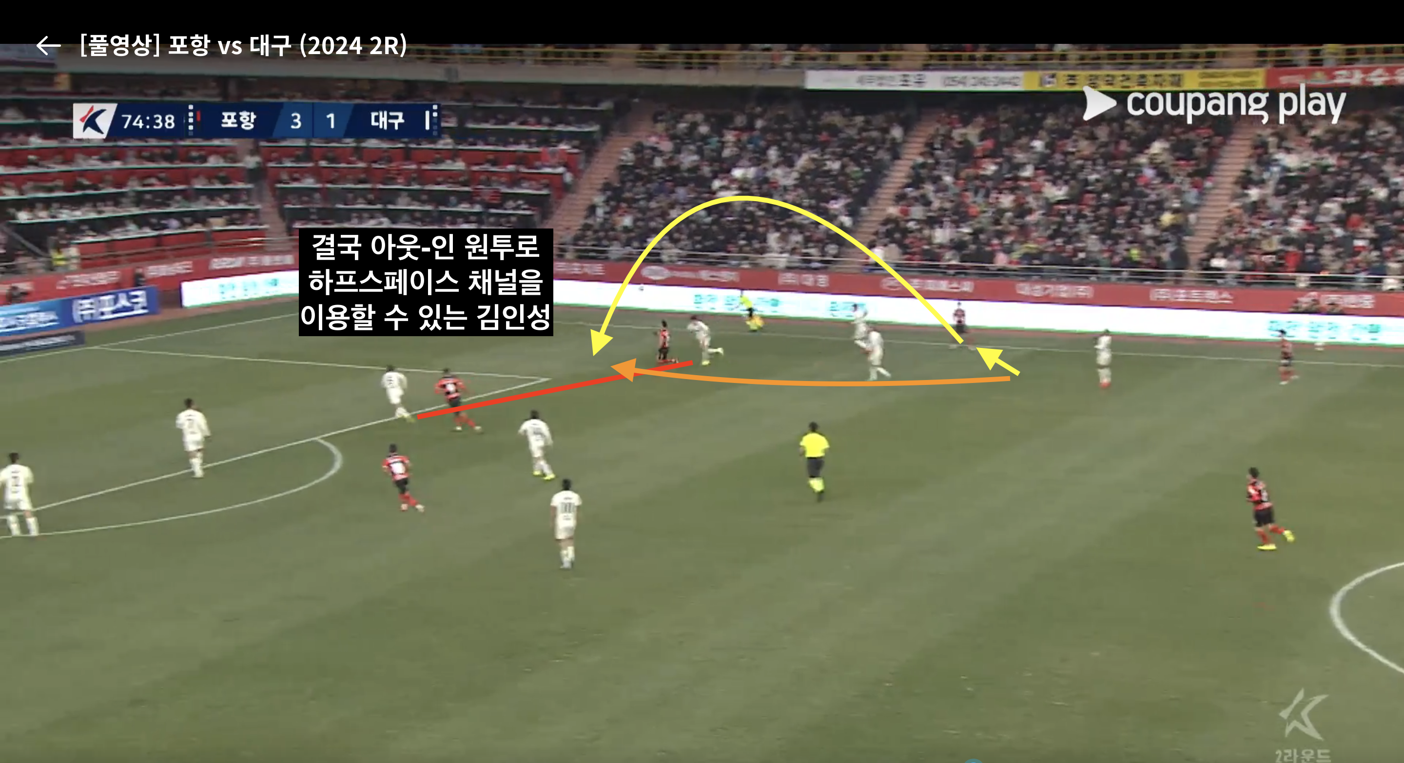 측면으로 볼이 갔을 때 대구는 3명의 선수가 과도하게 측면으로 쏠린 장면이 나오게 되었다. 결국 자연스럽게 하프스페이스 채널은 넓어졌고, 김인성이 수비수 등 뒤로 채널침투를 이어나가는 모습을 볼 수 있다. 하프스페이스 채널을 후반동안 총 3번이나 허용하여 광주는 미드필더의 백라인 커버로 김인성에게 향하는 키패스를 적절한 위치에서 끊어내거나 연결이 되어도 지연을 시킬 수 있는 구조를 만들 필요가 있다.
