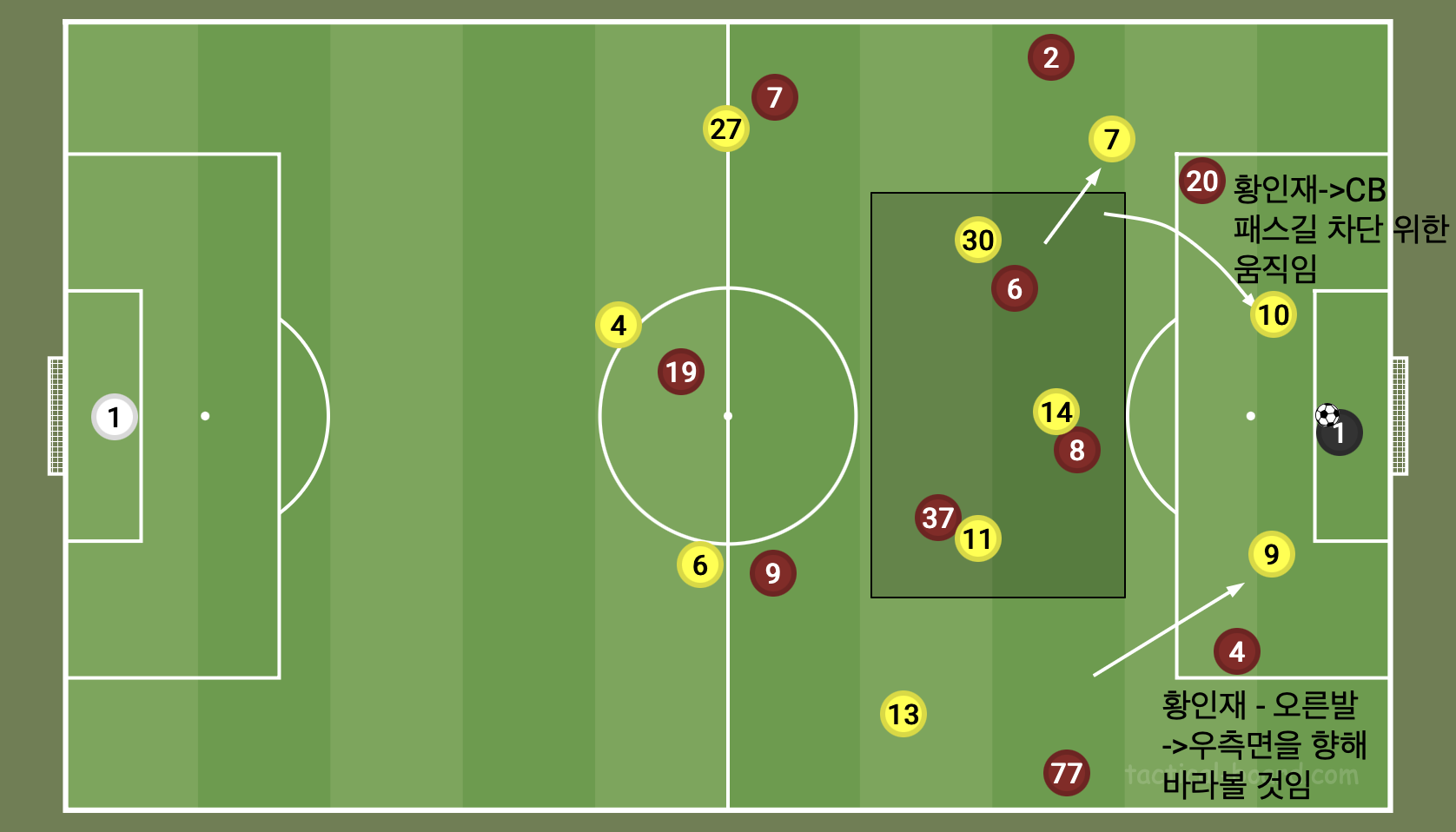 이번에는 한찬희가 볼을 잡고 있을 때 홍윤상이 오른쪽 하프스페이스에서 MF라인 등 뒤를 점유하는 모습이다. 그렇기 때문에 한찬희와 홍윤상 쪽에서 2vs1 수적우위를 점할 수 있었다. 또한 수적열세로 인하여 마크맨을 설정하는 데 있어 망설임이 생겼고, 압박타이밍이 늦어 한찬희가 포켓에서 프리맨이 된 동료를 찾을 여유를 내주게 되었다.
