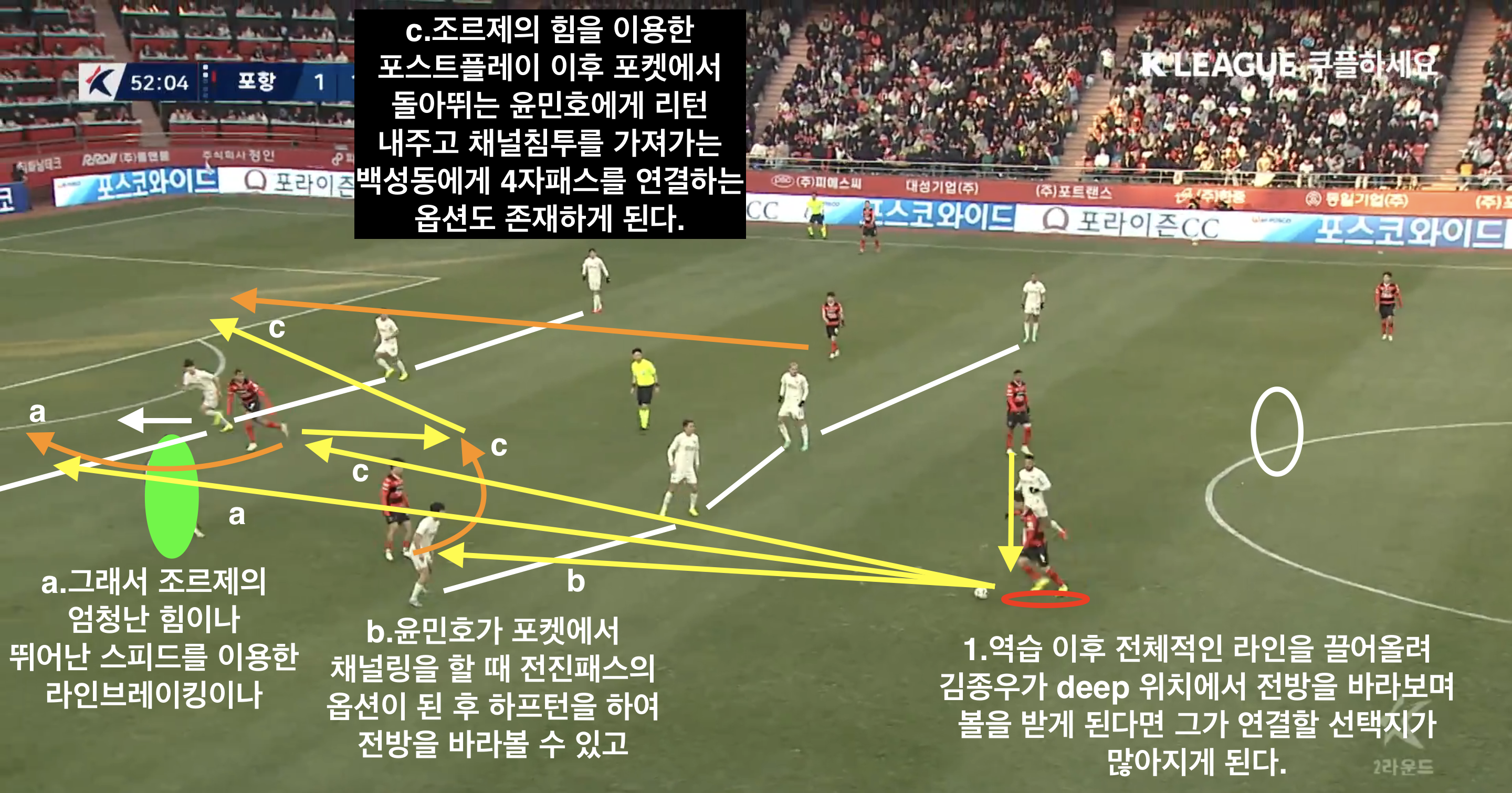 그렇게 포항은 로우빌드업 상황에서 상대를 끌어들인 후 롱볼을 공격수에게 투입한다. 조르제는 190cm에 84kg로 엄청난 힘을 발휘할 수 있기 때문에 보통 중앙으로 들어와 타겟맨 역할을 한다.