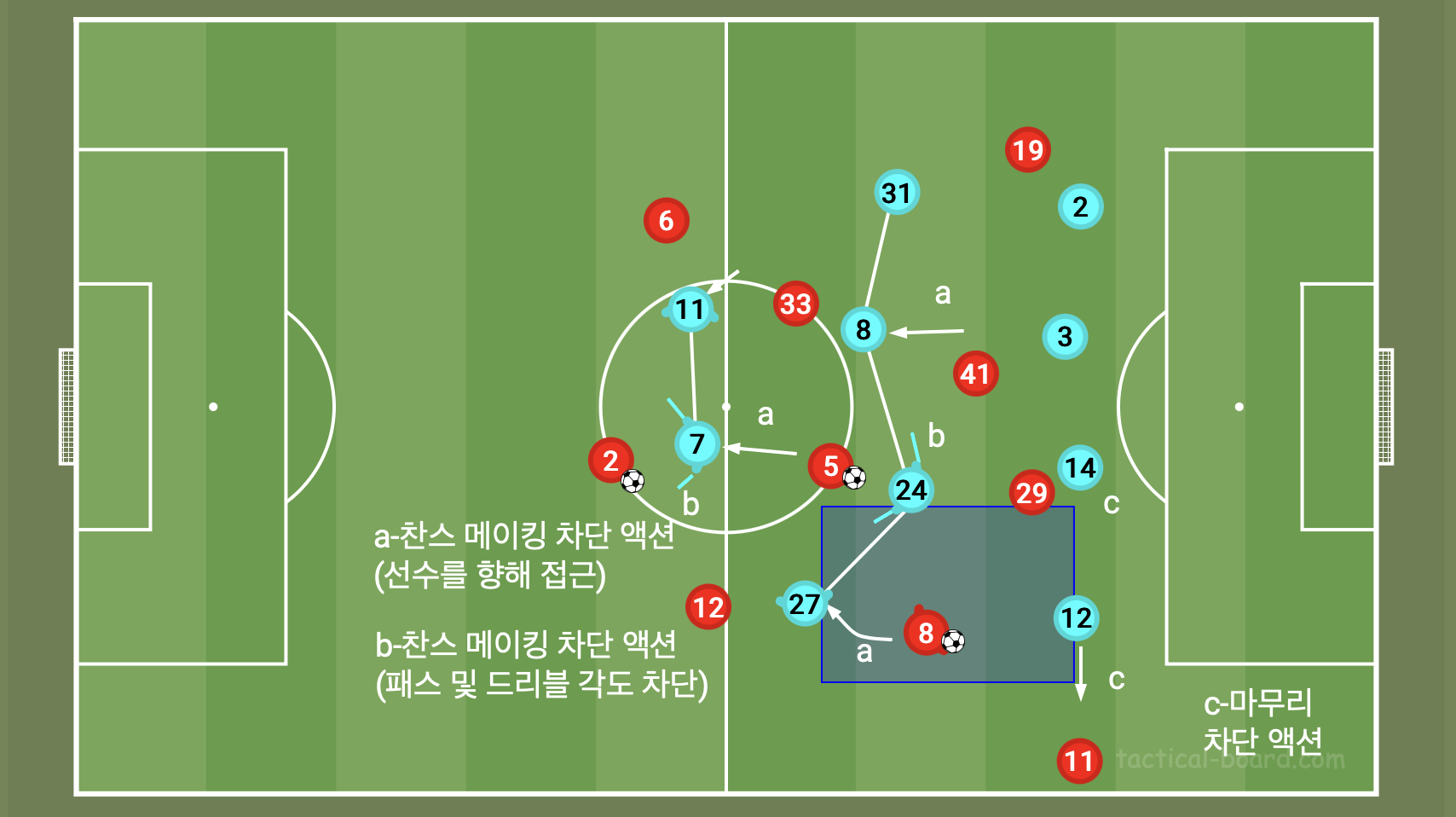 수비에는 찬스가 나오기 전까지의 과정을 막는 과정과 마무리를 막는 과정이 존재한다. 찬스가 나오기 전까지의 과정은 수비의 미들라인이 OUT 되고 수비라인을 맞딱드리는 상황을 말하는 것이다. 수비는 1차적으로 상대의 공격을 지연시키고 막는 것이다. 공격팀이 각각의 수비라인을 공략하고 찬스를 만들기 전에 수비가 사전에 공격을 차단하거나 지연시키는 것은 찬스가 나오기 전까지의 과정을 막는 과정이다. 하지만 상대 공격이 미들 라인을 OUT 시키고 볼을 잡은 공격수가 수비라인을 맞닥뜨릴 때 상황이 연출되거나 수비라인이 OUT 되었을 때 찬스가 나오게 된다. 이를 슈팅이나 득점으로 이어지지 못하도록 만드는 것이 마무리를 막는 과정이다. 주의할 점은 찬스 창출을 막거나 마무리를 막는 과정은 위치를 불문하고 공이 위치한 라인에 따라 구분되는 것이다. 그래서 게임을 분석할 때 찬스를 기준으로 공격과 수비의 세부적인 국면과 위치에 따라 다르게 분석을 해야 한다.