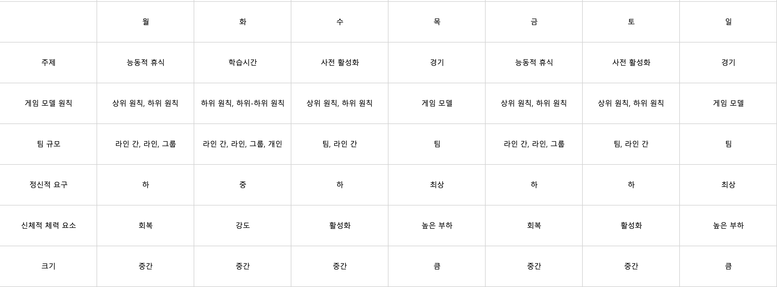 앞에 언급한 특수성과 수평적 변경 원칙을 이용해 축구 주기화 방법론을 주간 패턴에 적용했다. 축구 경기는 일요일에 있다고 가정했다. 아래 사진은 주기화의 예시를 보여주는 표이다.