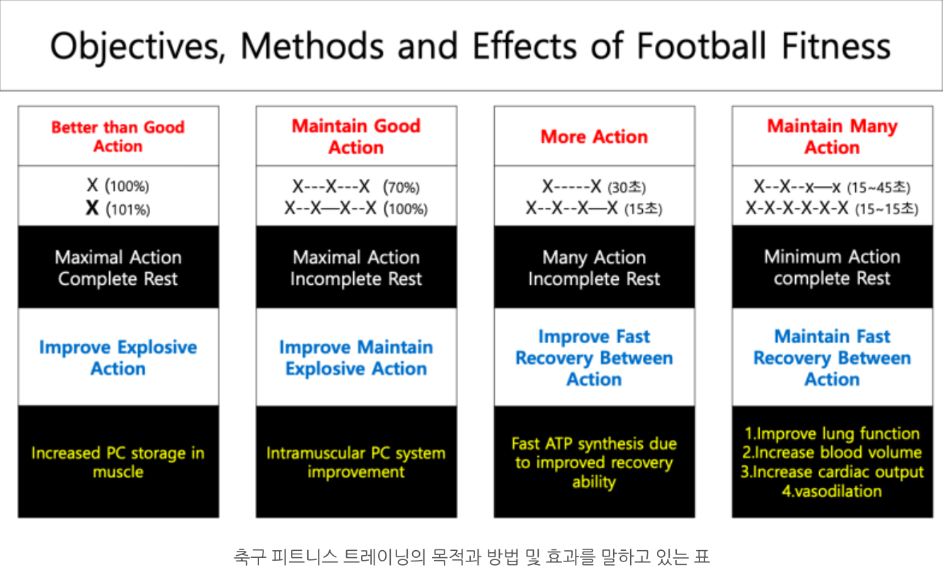 앞서 언급했던 풋볼액션에서 Decide How 단계를 볼 것이다. 순간, 위치, 방향, 속도가 있다. 축구는 마라톤이나 100m 달리기의 일부 특성을 갖고 있지만 그것이 메인은 아니다. 수많은 신체 방향전환이나 가감속, 점프가 자주 일어나는 저, 중, 고강도 움직임이 간헐적으로 나타난다. 그렇기 때문에 액션의 질을 유지하거나 짧은 거리의 고강도 액션을 90분 동안 발휘할 수 있는 회복능력이 좋아야 한다. 이는 풋볼 액션을 향상시키기 위한 풋볼 피트니스 훈련이기 때문에 축구 경기에서 특정 상황을 만들어 훈련을 하게 되면 풋볼 액션을 향상시키며 동시에 게임 모델을 학습할 수 있을 것이다. (김주표, 2024)