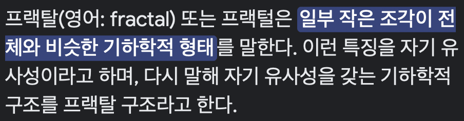 프랙탈(Fractal)의 사전적 의미이다. 일부 작은 조각이 전체와 비슷한 기하학적 형태이다. 즉 자기 유사성을 갖는 기하학적 구조라고 볼 수 있다.