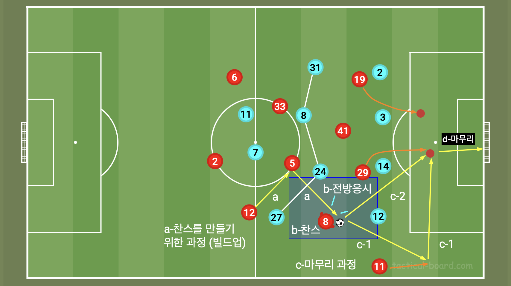 세부적으로 공격에는 찬스가 나오기 전까지의 과정과 마무리 과정이 존재한다. 찬스는 무엇인가? 골키퍼를 제외한 골문과 공을 가진 공격수 사이에 수비가 없을 때 슈팅을 할 수 있는 상황이다. 즉 수비라인이 OUT 되어 슈팅을 가져갈 수 있는 빌드업의 종착점이다. 그렇기에 팀 득점에 있어 가장 중요한 상황으로 볼 수 있다. 그렇기에 찬스가 나오기 전까지의 과정은 상대 수비라인의 앞공간 및 뒷공간을 공략하고 전방을 바라볼 수 있는 위치적 우위에서 나온다. 보통 수비라인과 정면으로 맞닥뜨리는 상황, 수비블록이 2열 이상 정렬되었을 때 상대 미들라인을 OUT 시키기 까지의 과정 등을 말할 수 있다. 여기서는 백라인 뒷공간이 OUT 된 상황도 포함이다. 그래서 필자는 미들라인 OUT 패스에 집착을 하게 된 것이고 이 패스는 팀의 빌드업 스타일을 볼 수 있는 가장 좋은 지표이다. 이후 슈팅으로 이어진 액션은 마무리 과정으로 볼 수 있다.
