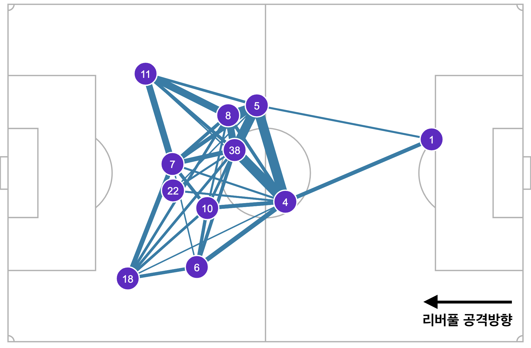 번리vs리버풀 경기의 패스맵을 보자. 전체적으로 고른 포지셔닝을 가지고 있지만 반다이크-코나테-소보슬라이-흐라벤베르흐쪽이 유독 굵은 것을 볼 수 있다. 반면에 비르츠, 에키티케, 마칼리스테르쪽은 비교적 얇은 것을 볼 수 있다. 이는 2선쪽으로 볼 투입이 쉽지 않았고 그 이후의 전진도 쉽지 않았다는 것을 알 수 있다. 또한 살라와 학포가 측면 넓게 배치되었는데 가까이 위치한 건 케르케즈 밖에 없다. 그들에게 공이 갔을 때 주변의 지원이 비교적 적어 그들이 1vs1 돌파를 해야 하는 상황이 많이 나왔다고 볼 수 있다.