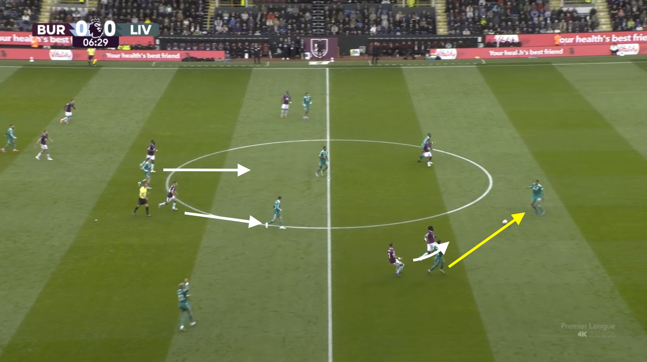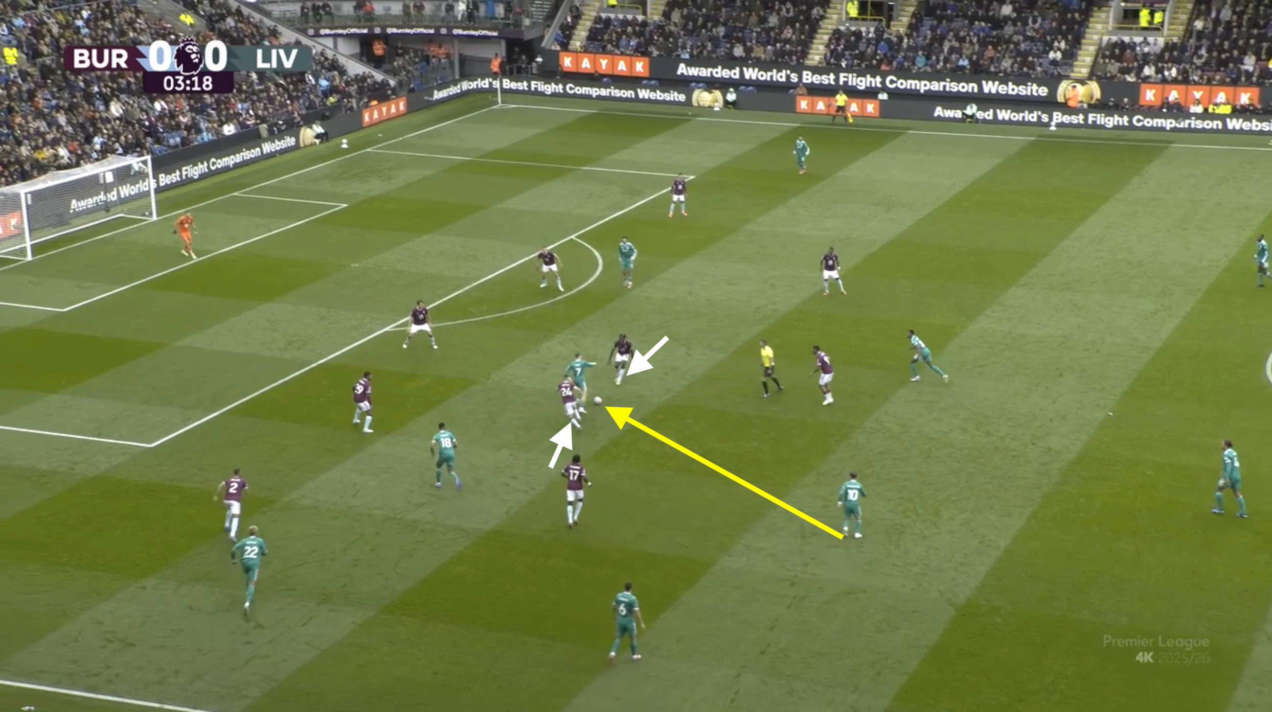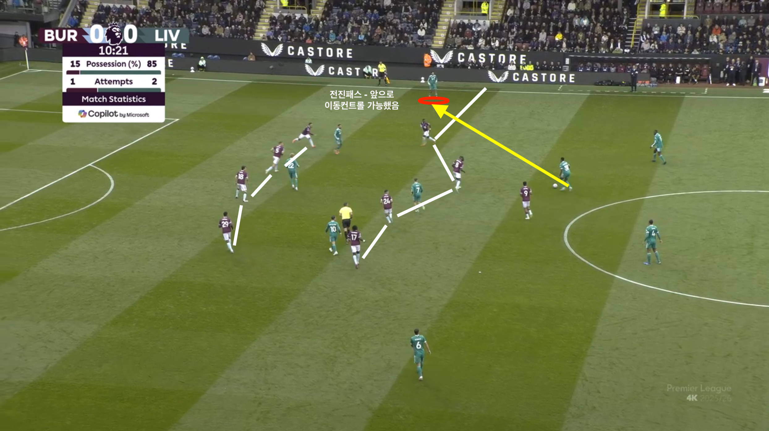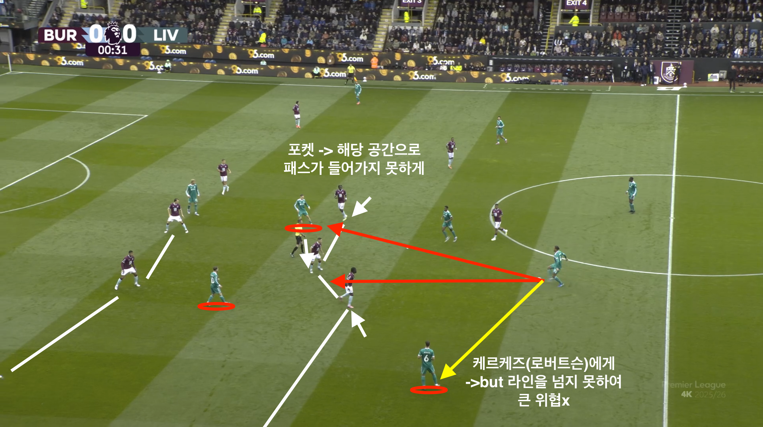 반다이크가 공을 잡았을 때 1순위로 비르츠나 마칼리스테르를 바라봤지만 이미 번리의 피벗들은 사이드스텝으로 패스루트를 차단하려는 사전 움직임을 보였기 때문에 쉽게 사이패스를 하기 어려웠다. 그래서 번리의 미들라인 앞에 위치한 케르케즈에게 연결을 하게 되었다.