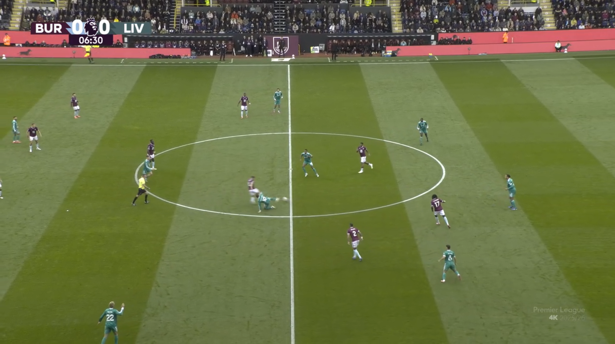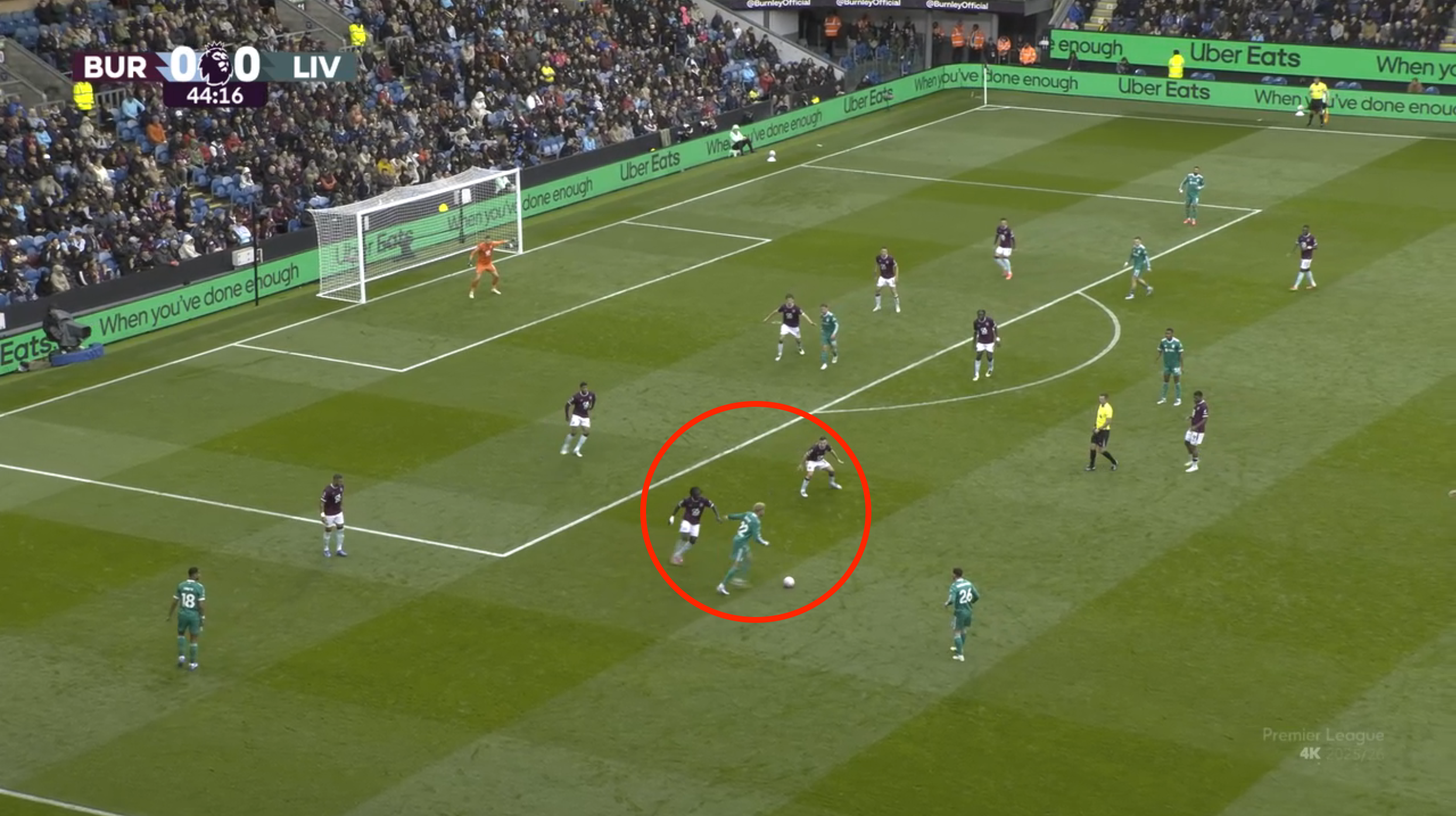 비르츠가 공을 잡게 되자 양옆에서 2명이 달라붙게 되어 비르츠가 패스 방향에 대한 미스를 저지르도록 만드는 장면이다. 리버풀이 비르츠를 중심으로 포켓공간에서의 연계를 기대했지만 비르츠를 향한 번리의 압박 타이밍이 좋았기 때문에 비르츠가 정확한 찬스메이킹이나 슈팅을 하지 못하게 되었다.