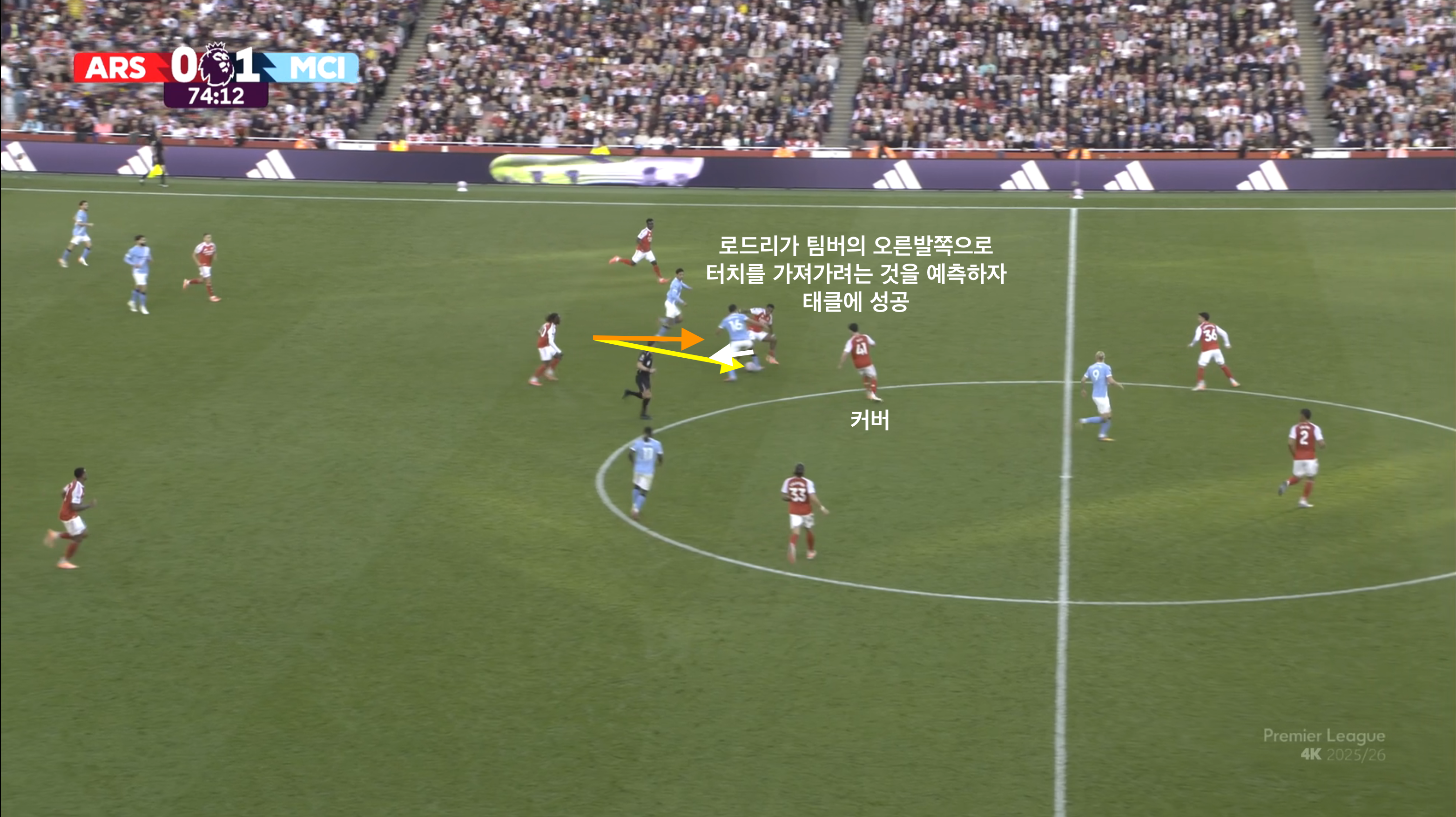 80분에는 맨시티의 늘어난 백라인 숫자에 대비하여 팀버 대신 마르티넬리를 교체하여 공격적인 교체를 진행했다. 그래서 아스날은 더더욱 백라인 뒷공간을 노리기 쉬웠고 마르티넬리는 시티 수비진에 비해 스피드적인 부분에서 Action Quality(김주표, 2024)에서 컨디션적 우위를 점할 수 있었다.