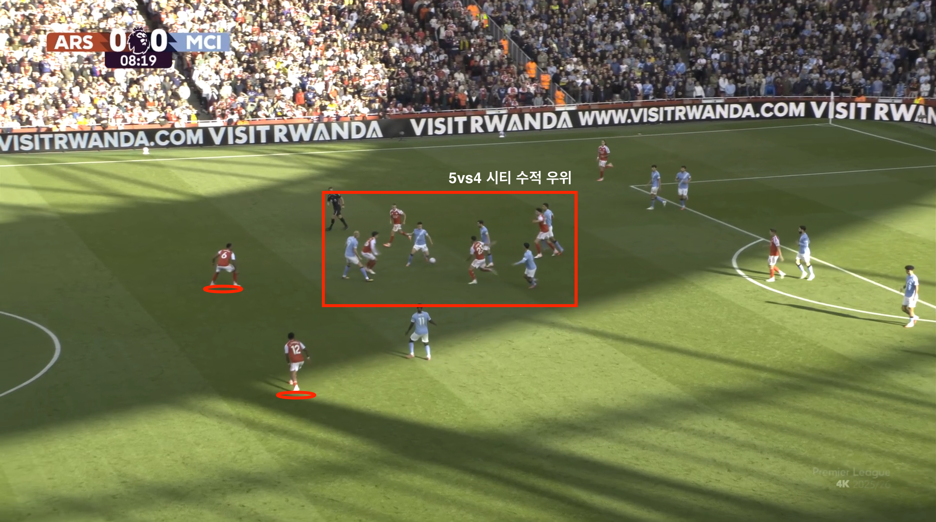 이날 맨시티는 아스날의 1-3-2 혹은 1-4-2 형태의 빌드업을 1-4-1-4-1 형태로 아스날의 백라인 혹은 3선 라인부터 막아내려 했었다. 즉 시티는 수비멘디와 라이스 혹은 칼라피오리가 공을 잡고 전방을 바라보지 못하게 만들려고 했었다. 그러나 수비멘디와 라이스, 칼라피오리는 끊임없이 빌드업에 관여하기 위해 사전 움직임을 통해 위치적 우위를 가져갔다. 또한 메리노가 끊임없이 라인더르스의 등 뒤를 노렸고 포든이 마갈량이스를 마크하기 위해 중앙 높은 곳에 위치했을 때 칼라피오리나 라이스에게 향하는 패스길을 적절히 막아내지 못해 왼쪽을 향한 빌드업도 원활하게 이뤄져 정말로 오랜만에 좌우 밸런스가 맞게 된 경기가 일어나게 되었다.