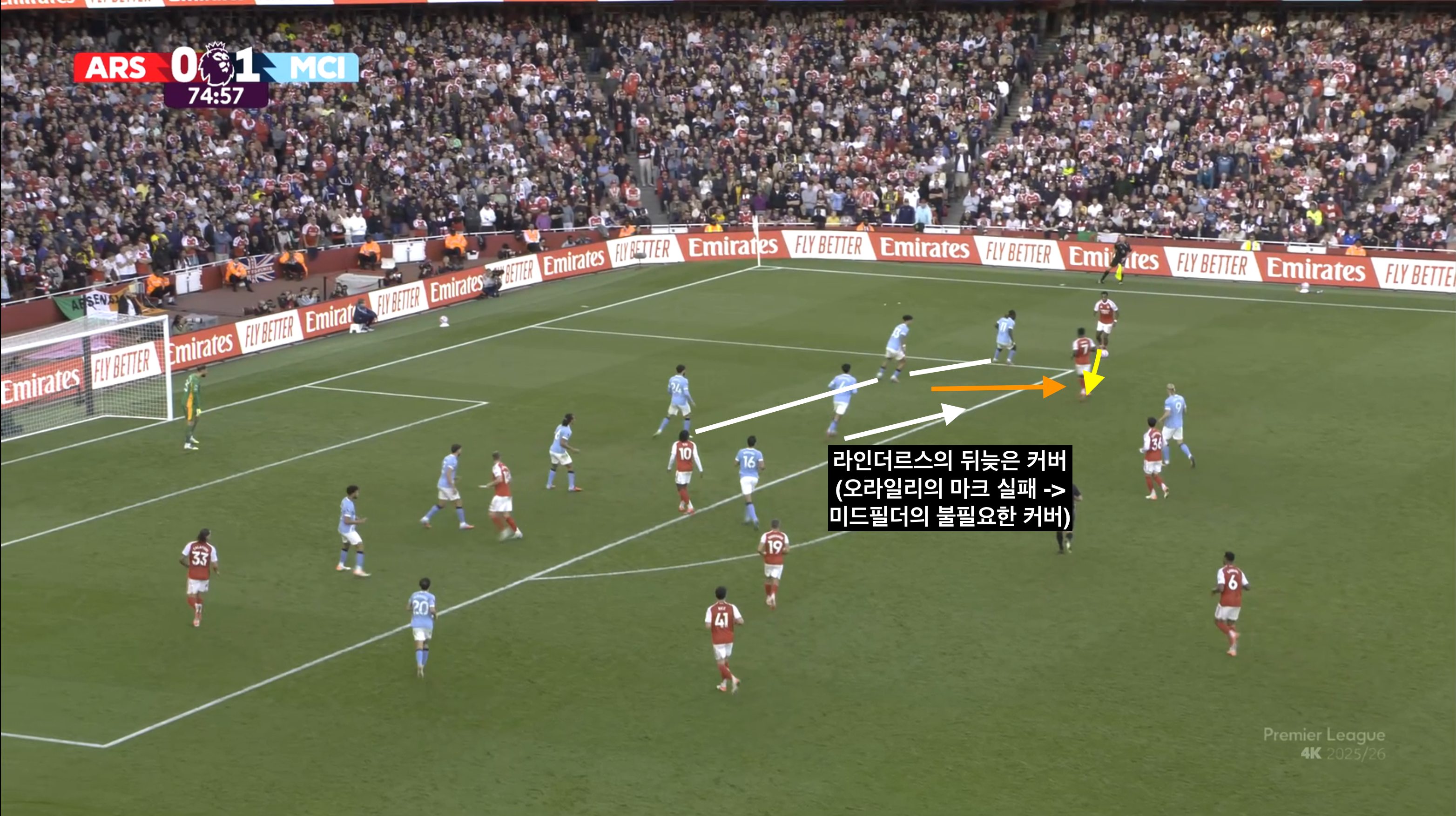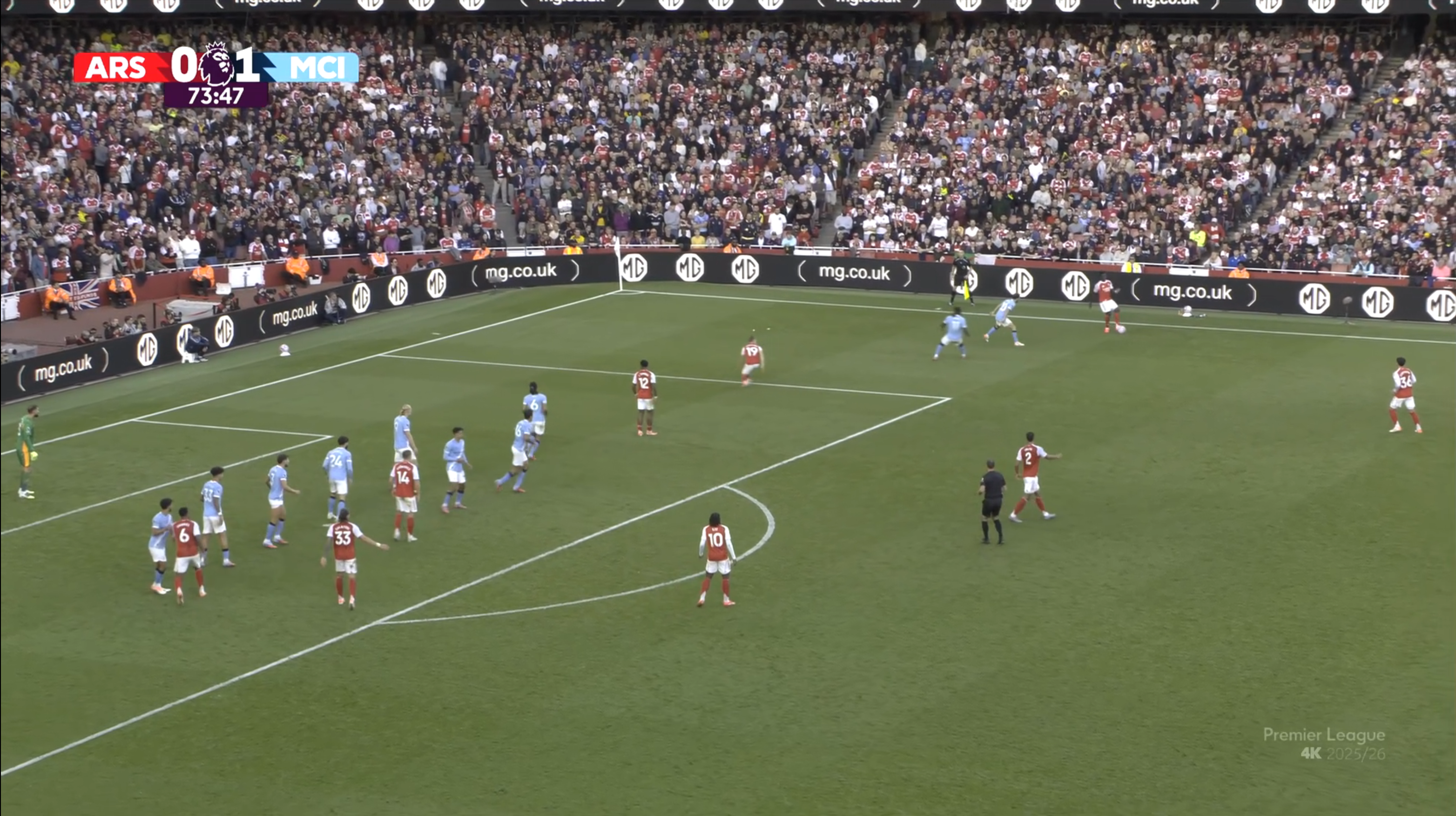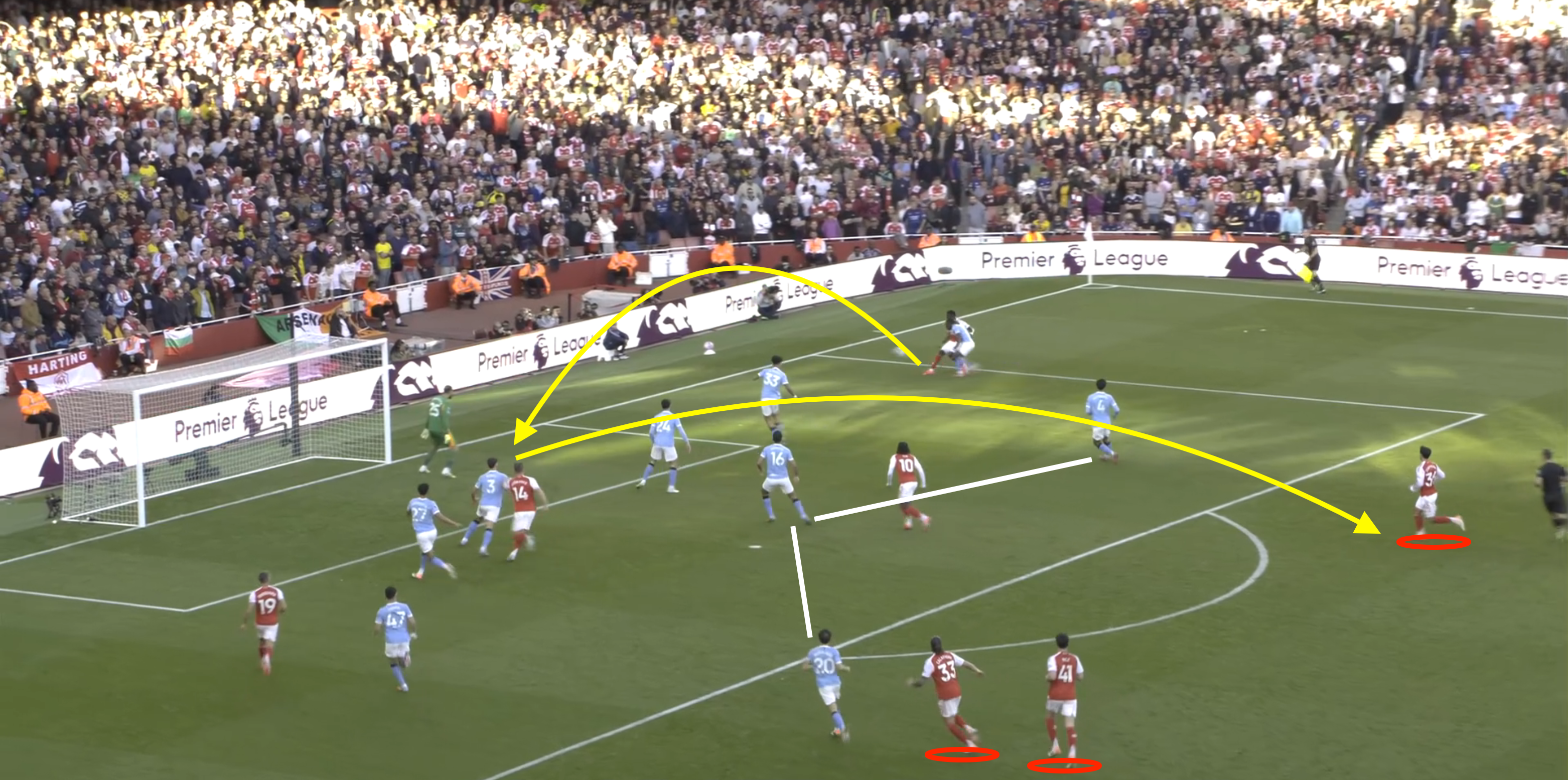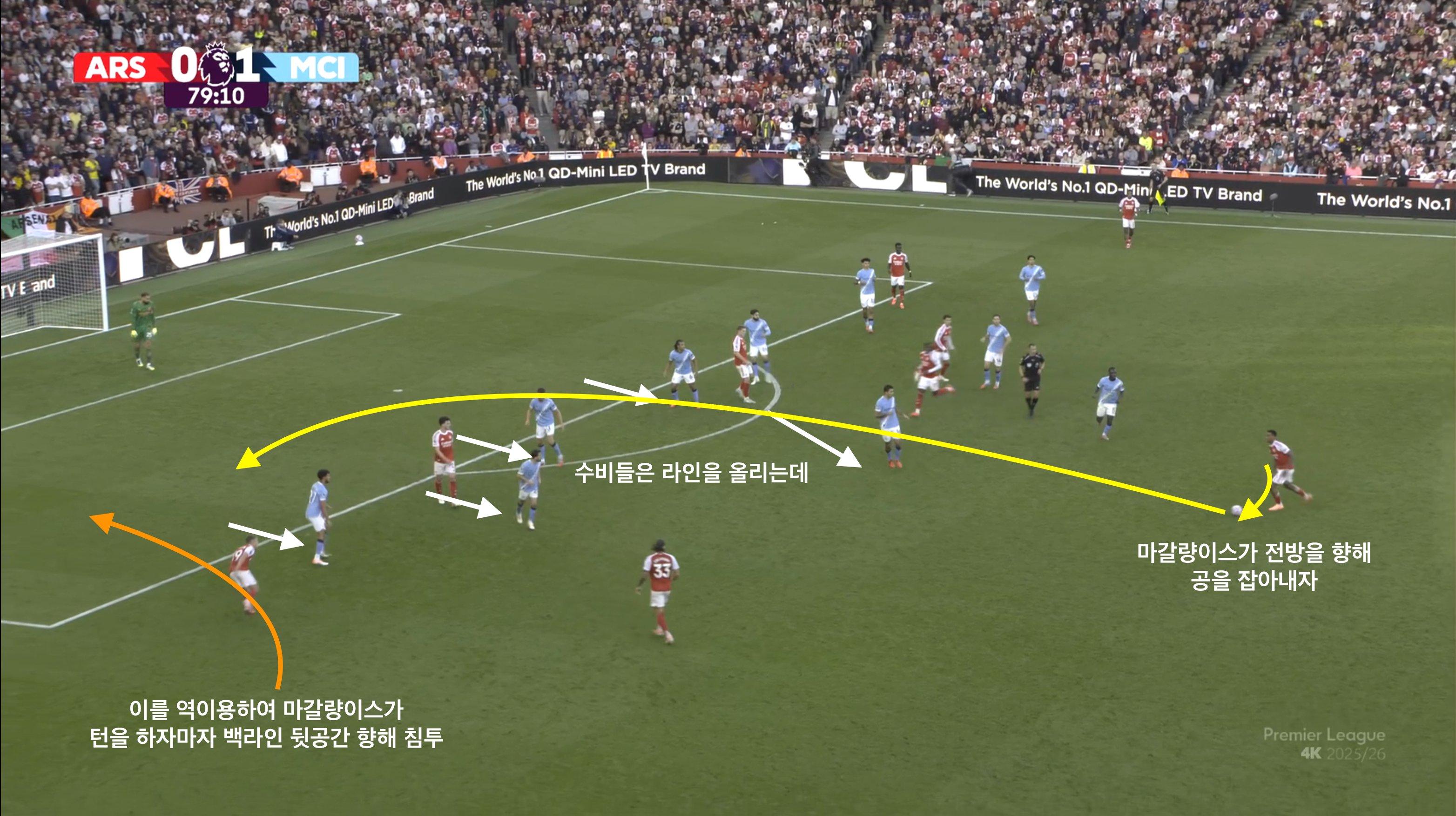 마갈량이스가 좁혔을 때 홀란은 반대로 넓혀 라인더르스의 좋은 패스를 받고 득점에 성공하였다. 그래서 득점이 필요해진 아스날은 더더욱 체력적인 우위를 이용하여 시티의 롱볼을 가져오고 상대의 마크를 적극적으로 벗겨냈다.